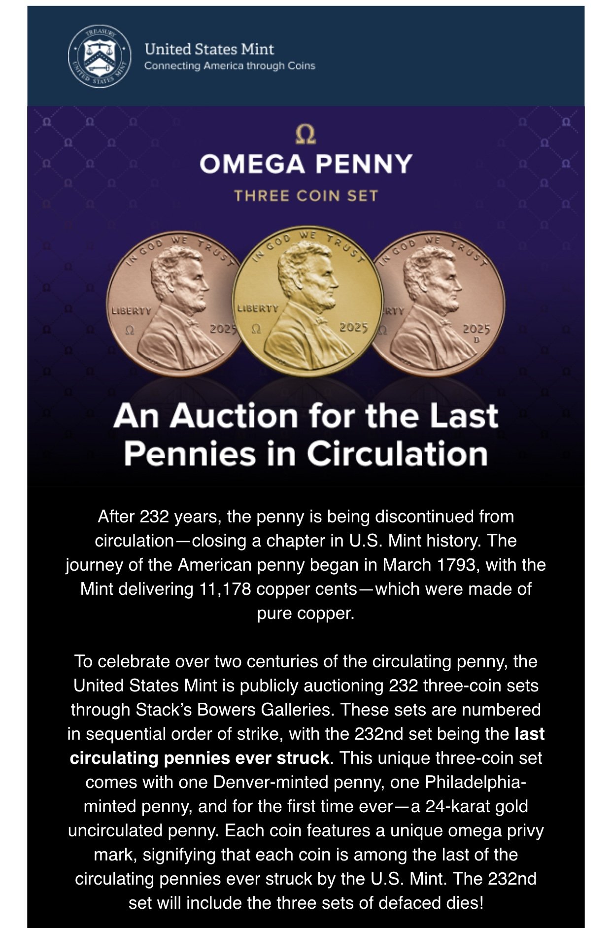 I just got this email from the mint about the last penny and auctioning of all the Pennies.