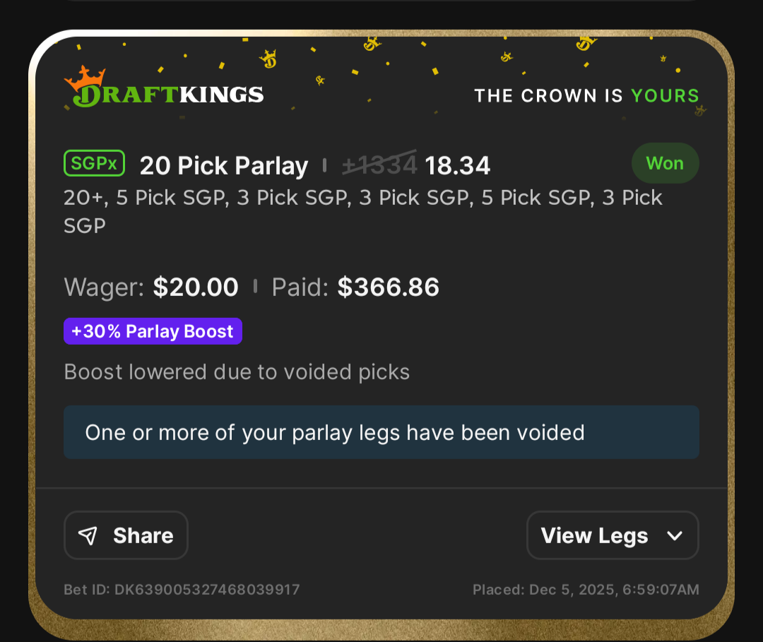 Yep I smacked a 20 leg NBA parlay, a mix of 3 pointers and PRA legs.