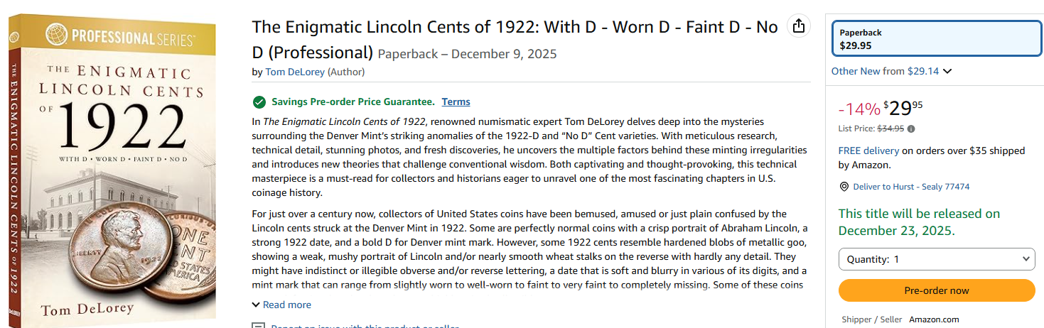 Just checked my order for Enigmatic 1922 Lincoln cent book on Amazon. They are showing a picture of the professional edition of Tom's book as what I will be receiving. No delivery date given but it's still early.