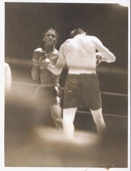 In 1932 Kid Chocolate defended his junior lightweight championship with a 10-round unanimous decision over Eddie Shea in Chicago. This image captures Chocolate sending Shea to the canvas in round 3.