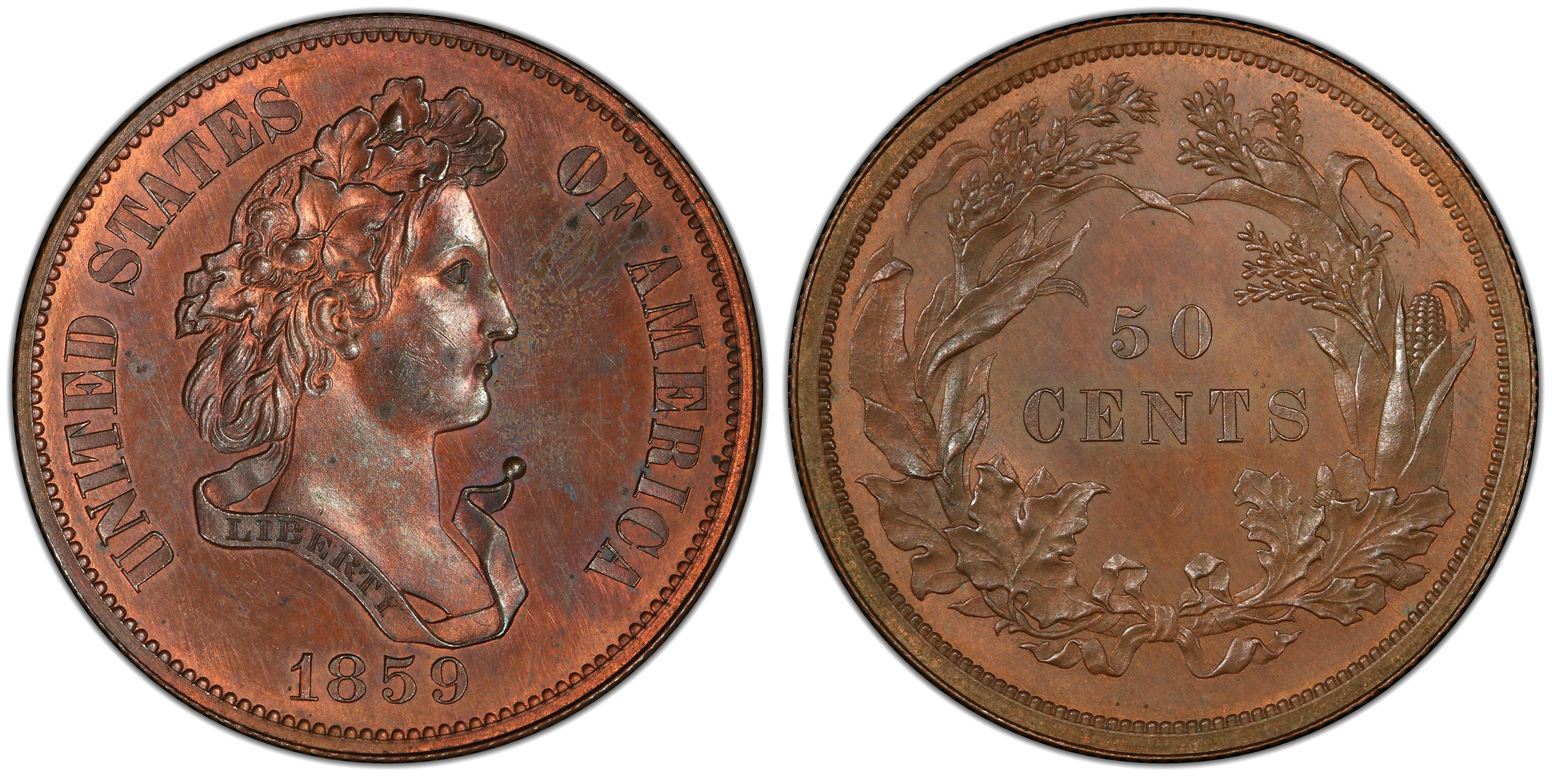 The obverse is similar to the issued Indian Cent, but dated 1858. The reverse is similar to the issued 1860 cent reverse, except there is no shield between the ends of the laurel wreath. This is the centered date, broad bust point variant, thus the Pollock-262.