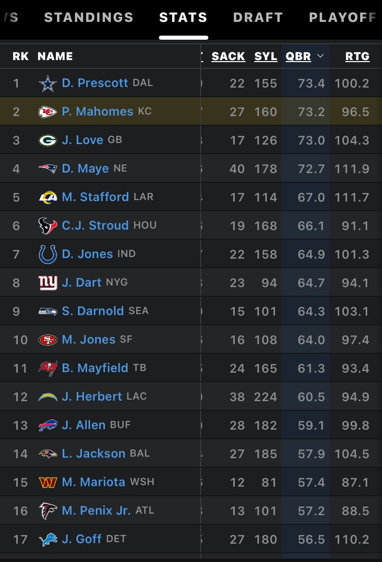 I still don’t know about QBR. For instance, Jarrod Goff against Dallas had a 111 passer rating, high completion percentage, high yards per completion, 1 TD, zero picks. No fumbles and only sacked once.