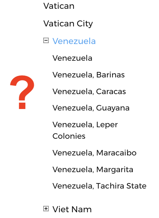 Click on that first "Venezuela", below the category header - the one without a province name. It should give you a full country count summary, then scroll through several pages to find the two that have a number under PO1.