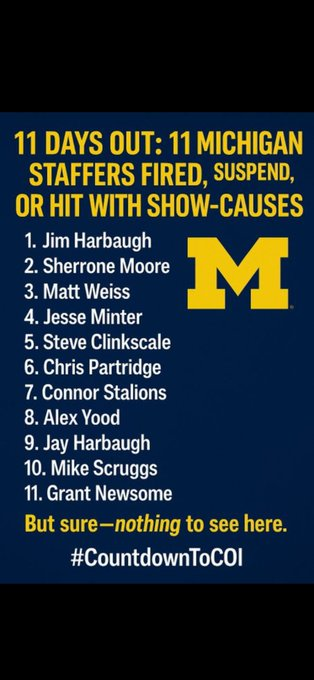 Agreed. Been a corrupt program for years now. Its also the NCAA's fault for not penalizing them for the sign stealing. All they got was a slap on the wrist. Before the Ohio State game a few yrs ago, they used a camera man to try to take out JT Barrett before the game by hitting him in the knee. The flag planting last year. They've turned into a low life program, and they need to clean house.