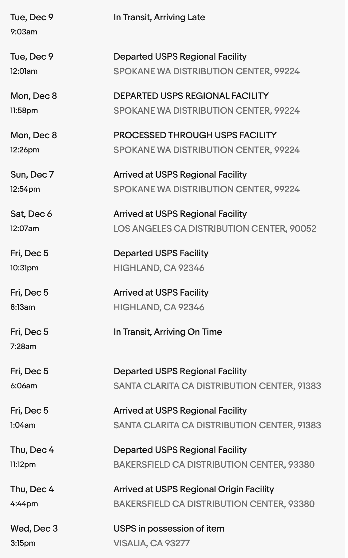 Mon, Dec 8 12:00am In Transit to Next Facility, Arriving Late