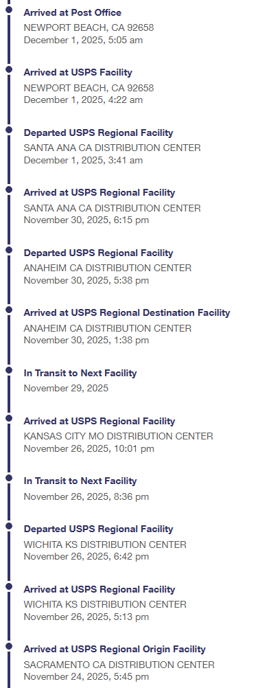 Thu, Dec 4 5:44am Arrived at USPS Facility OLATHE, KS 66061