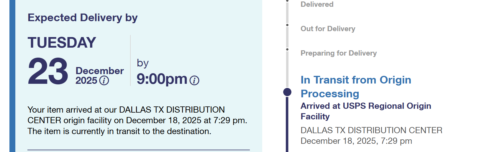 Don’t count on USPS tracking. For 2 days showed stuck in Texas estimated delivery on Monday. This morning it is out for delivery today . πŸ€—πŸ€—πŸ˜πŸ˜