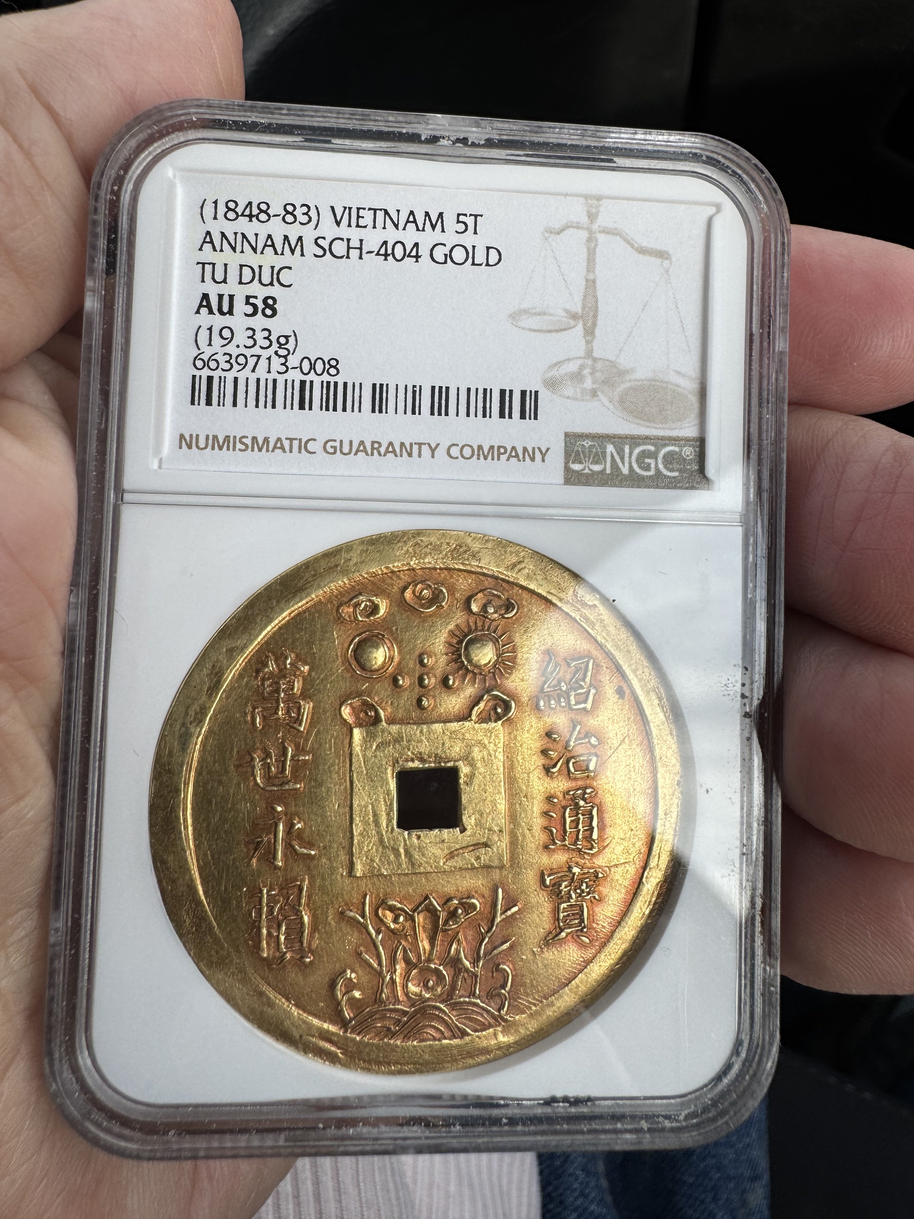 • Obv. Around the central hole : Thieu Tri thông bao, on the left ; Van thê vinh lai, on the right ; moon and sun under clouds above ; 3 mountains with longevity trees in the middle of the sea below.