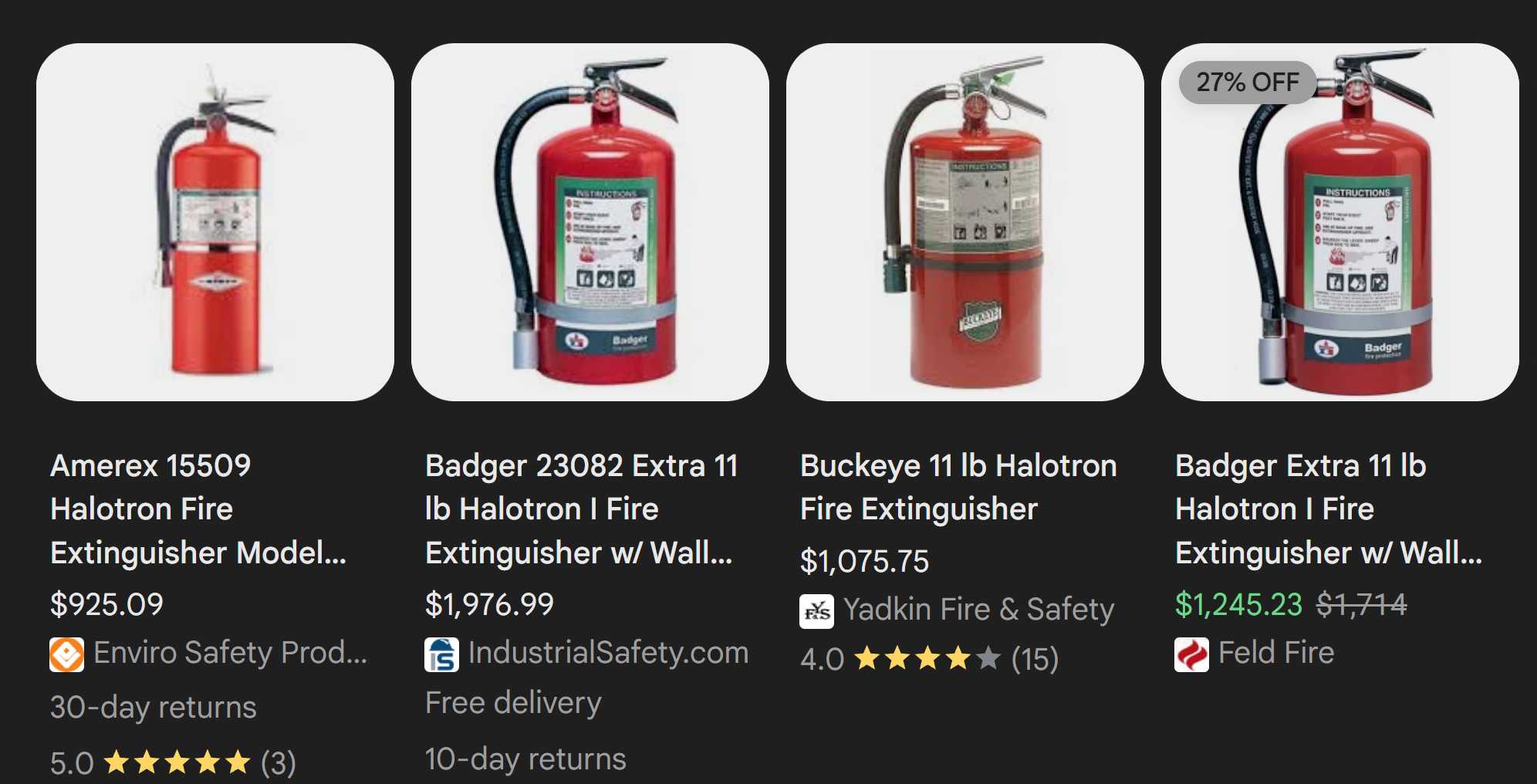 A Water Mist extinguisher. You can fill it with deionized water and find a local Nitrogen tire fill business that can pressurize the tank with nitrogen [though you can use a regular air pump at a gas station if you want to cheap out on your fire extinguisher]. The downside is that water will get everywhere and possibly damage my collection more. However, they are significantly cheaper. The cheapest one I could find for a 2.5 gallon water mist extinguisher was $159 on Amazon.