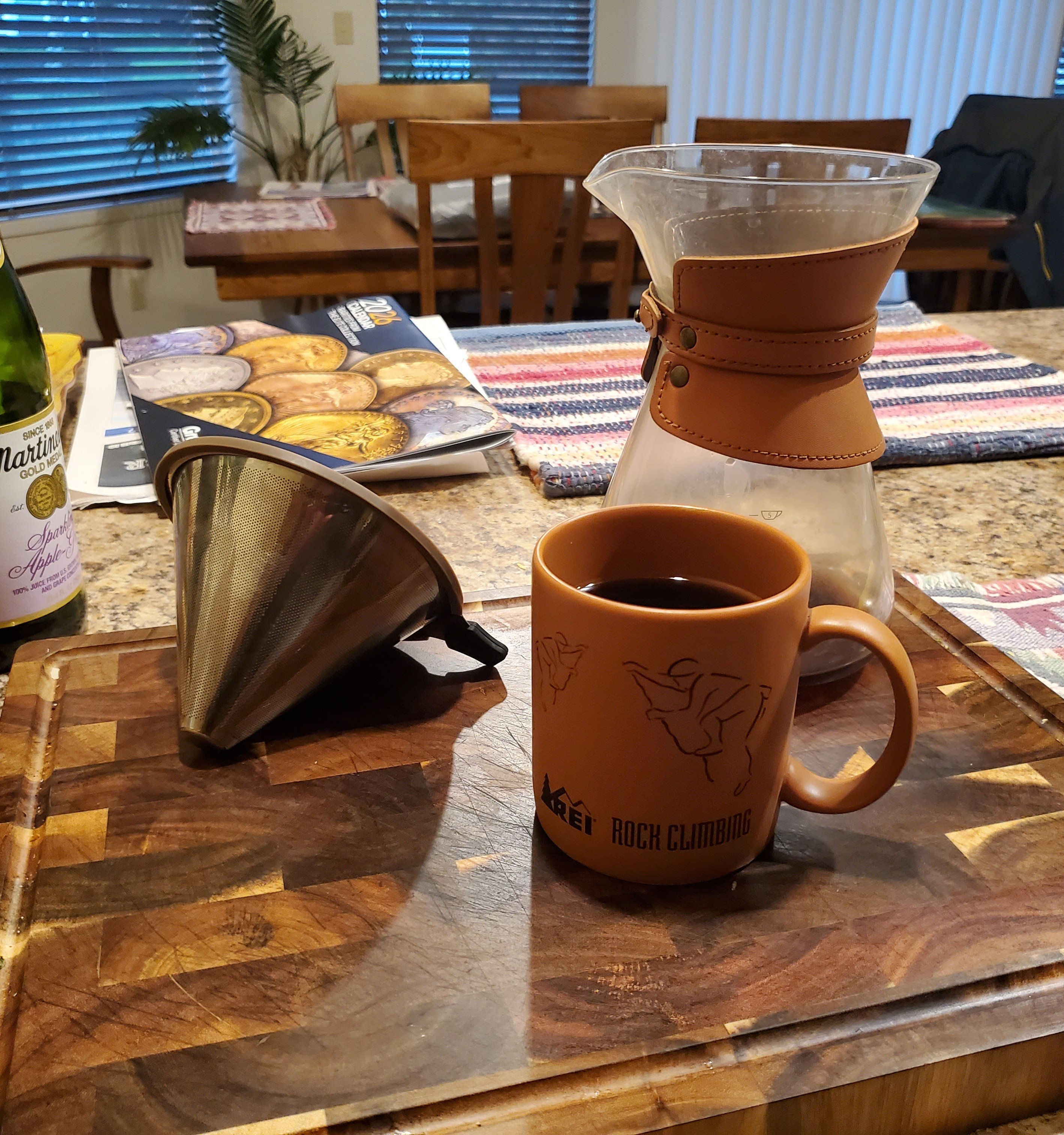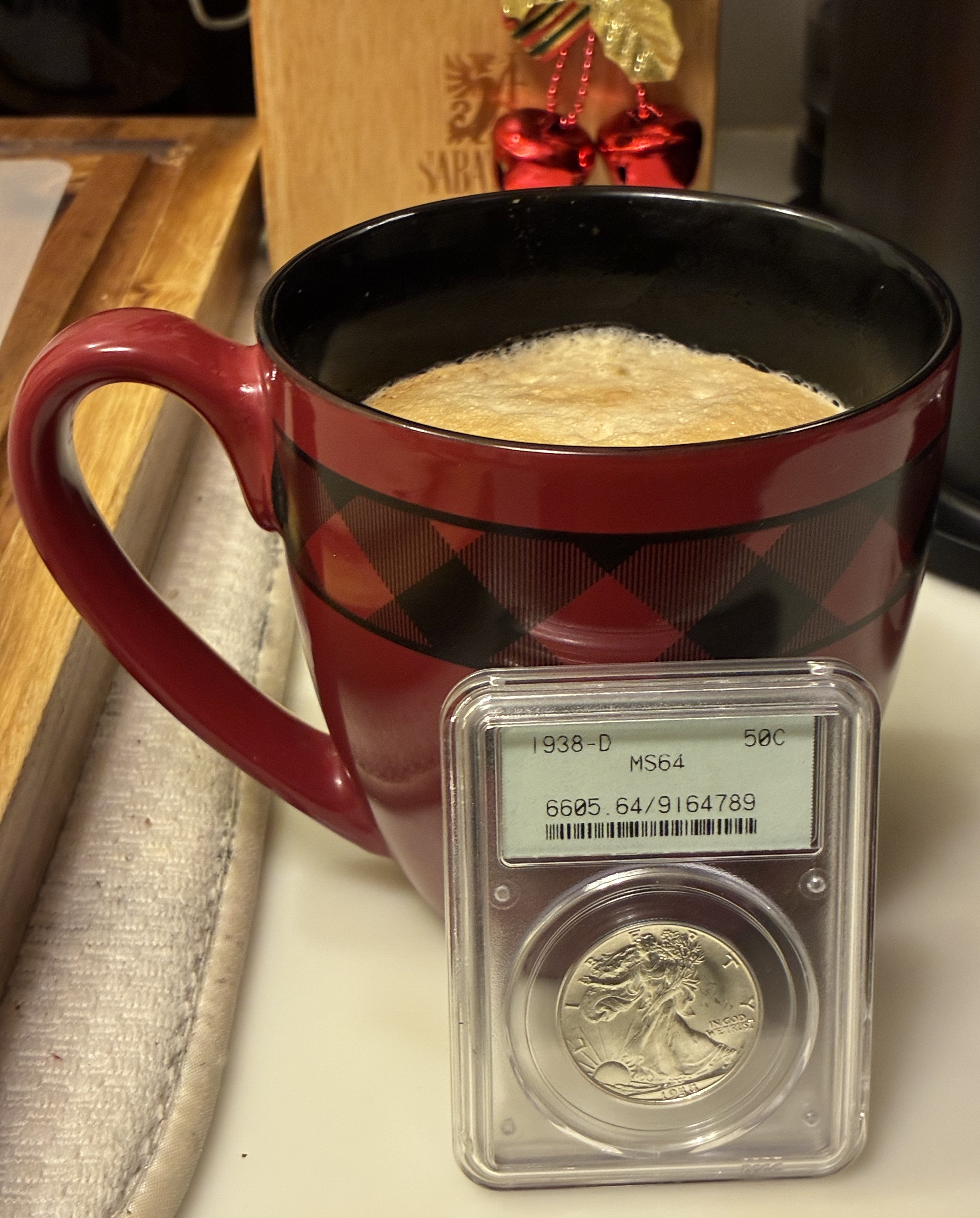 A little Christmas blend the morning, hot and black. Coins never too far away.