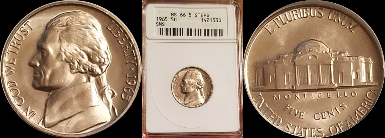 You’d think I’d have completed the 1965 SMS set by now. I did have the nickel and the half, but got bored with the idea and sold them. They were rather eclipsed by the cent, which I kept.