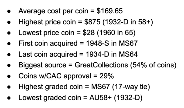 The coins range from under $50 to $500, with only a single coin (32-D, not in the date set) higher; average cost per coin is $150. My budget is roughly proportional to the weighted coin set value as prescribed by the PCGS set.
