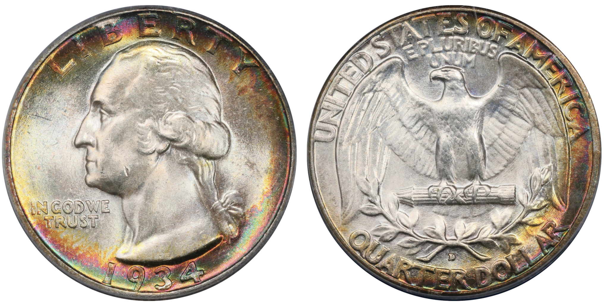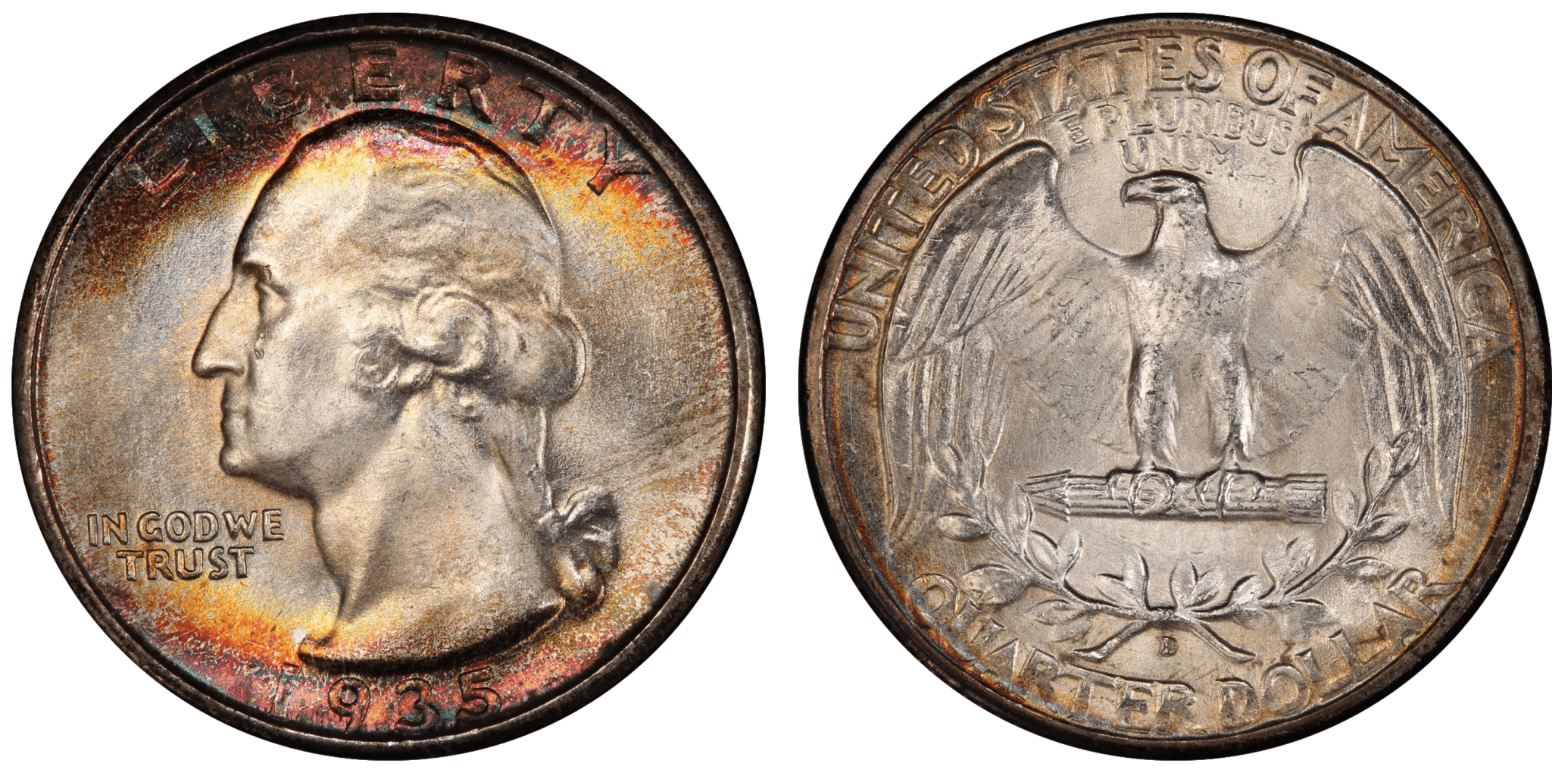 I was very lucky to find the ‘35-D, it’s a 66+ CAC and is the second most expensive coin in my full set, behind only the ‘32-D. I stretched for a nicer coin than budgeted because this issue is quite scare with attractive toning in any but the highest grades, and I wasn’t sure I’d see another. It also has rainbow toning in a very tight range near the reverse rim. Here’s a closer look: