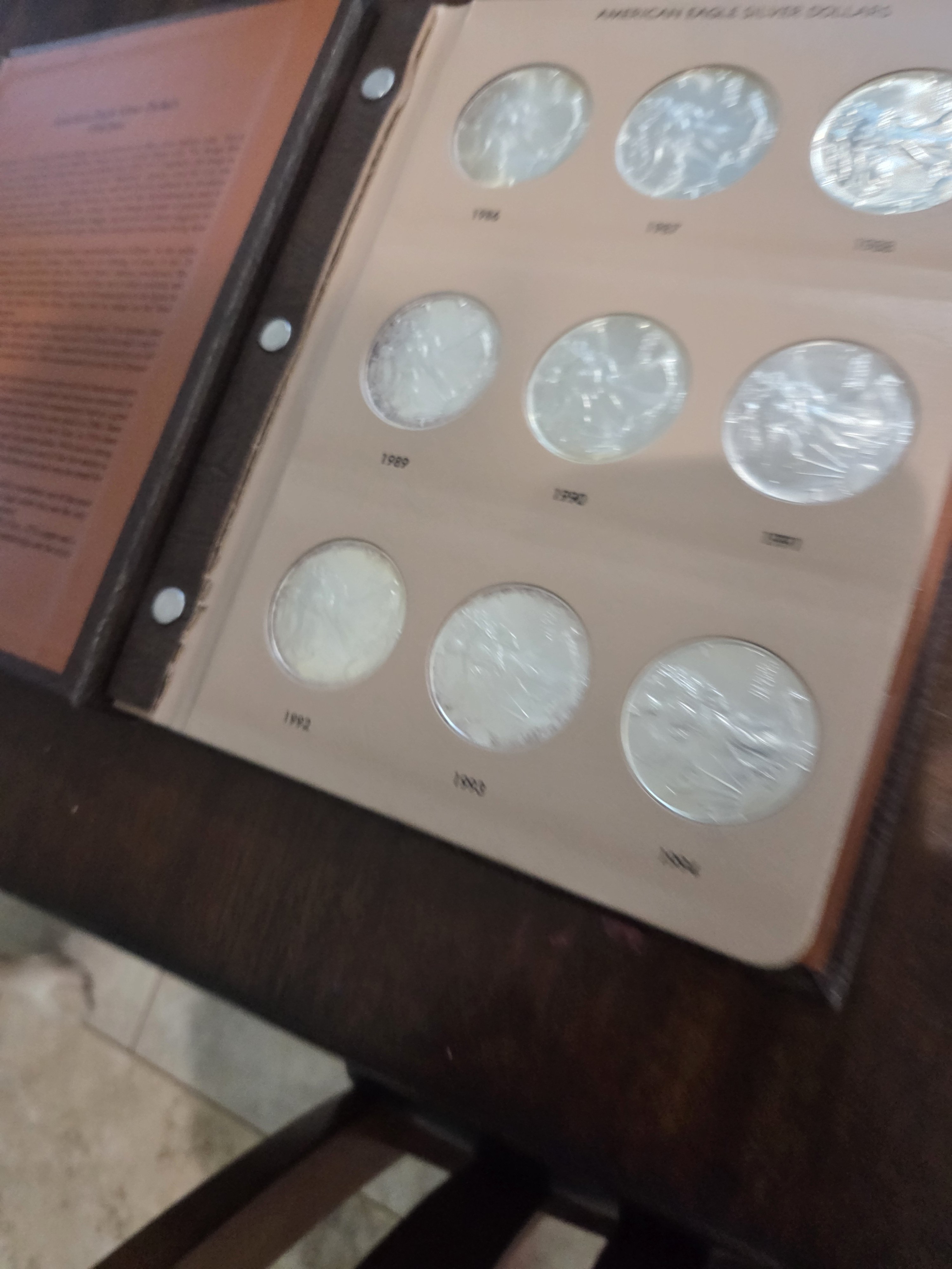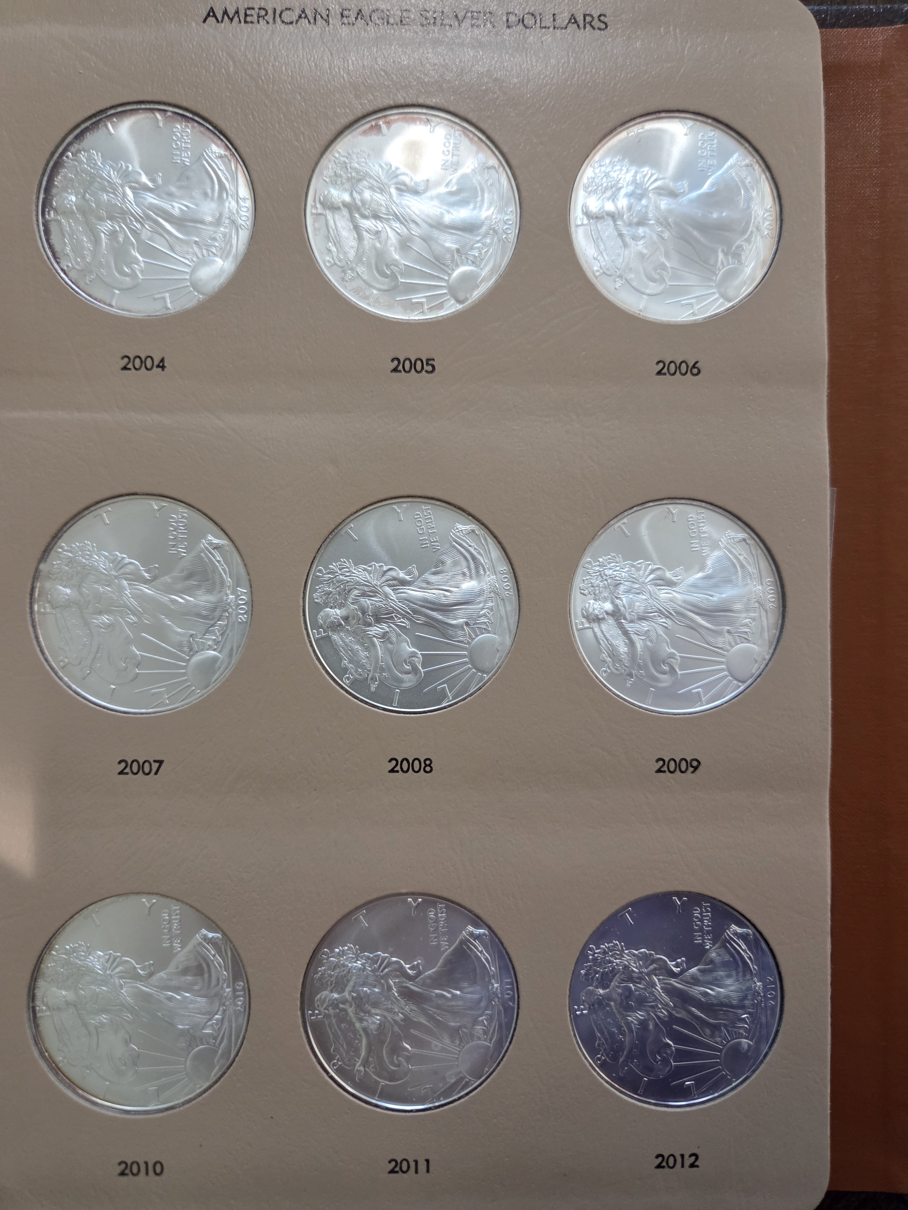 For your consideration, I have a Dansco set of 1 oz American Silver Eagles, from 1986-2020. The set is housed in a fairly nice albumn, but it does have a number on the binder (not sure if that will come off). The set does have some toning (please see pictures). But also, I think any and all the toning will magically disappear with a bit of dip, so while the photos don't look great, I think the coins themselves are fine.