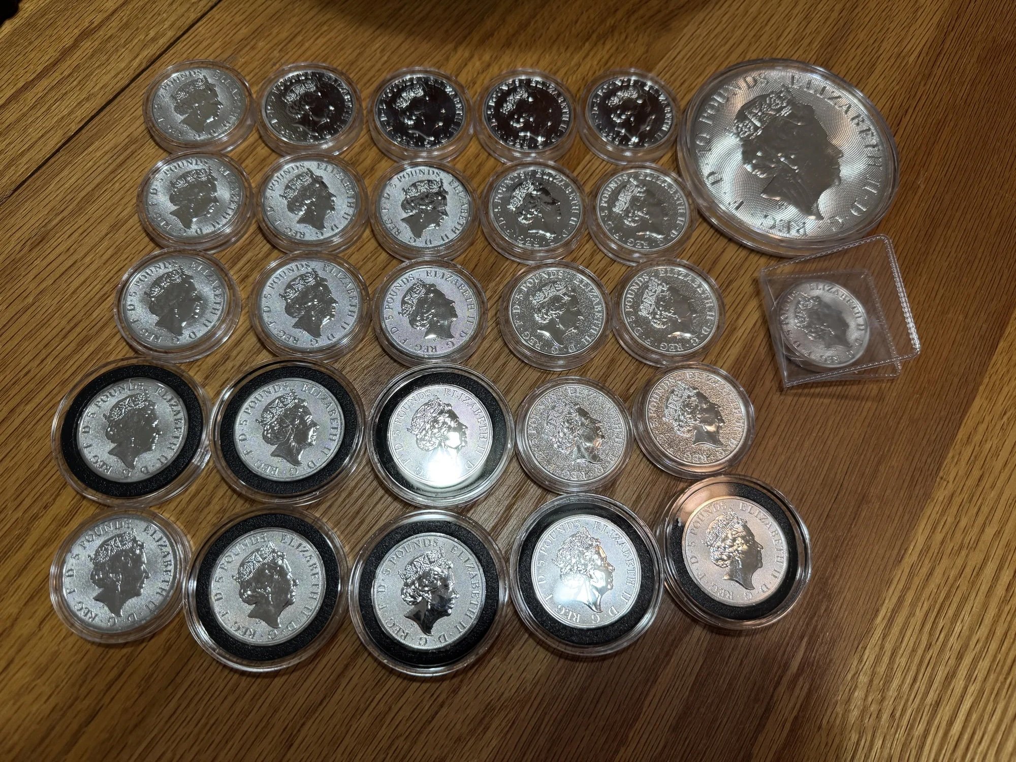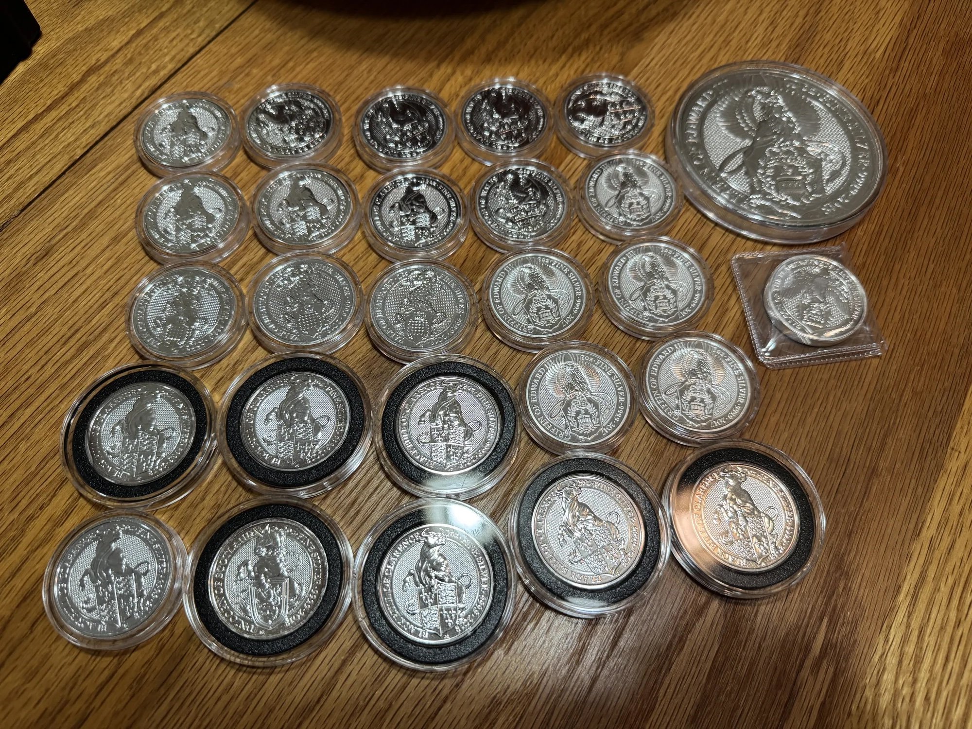 Mix of Queen Beasts Series 2 oz and 10 oz rounds all in capsules less the one in a flip. Total of 62 oz - CURRENT SPOT MINUS $2 x 62 = Selling Price.- Venmo or USPS Money Order. Includes insured shipping to you. I should have a couple references in signature line - pm me if you have questions. Selling as lot and not interested in breaking up or trading. If interested, PM me screen shot of current SPOT from JM Bullion and we'll lock in deal.