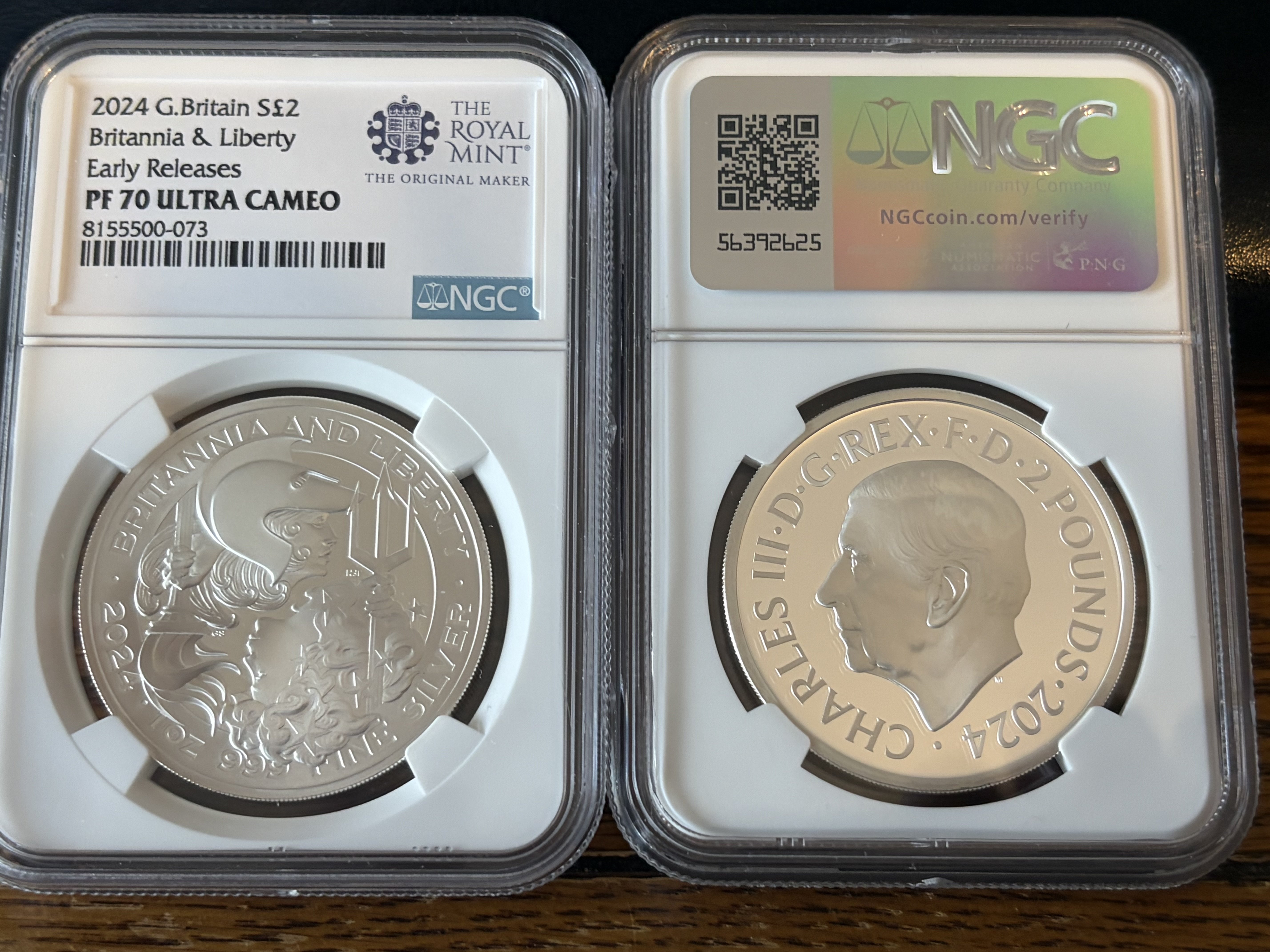 2024 Britannia and Liberty NGC PR 70 Ultra Cameo Early Release- This one ounce silver proof coin is a collaboration between the Chief Engravers of The Royal Mint and the United States Mint and features the images of Britannia for the UK and Liberty for the USA. Diameter 38.61mm and weighs 31.21g. 999 Fine Silver. Denominated as £2. $150 each - I have 9 for sale
