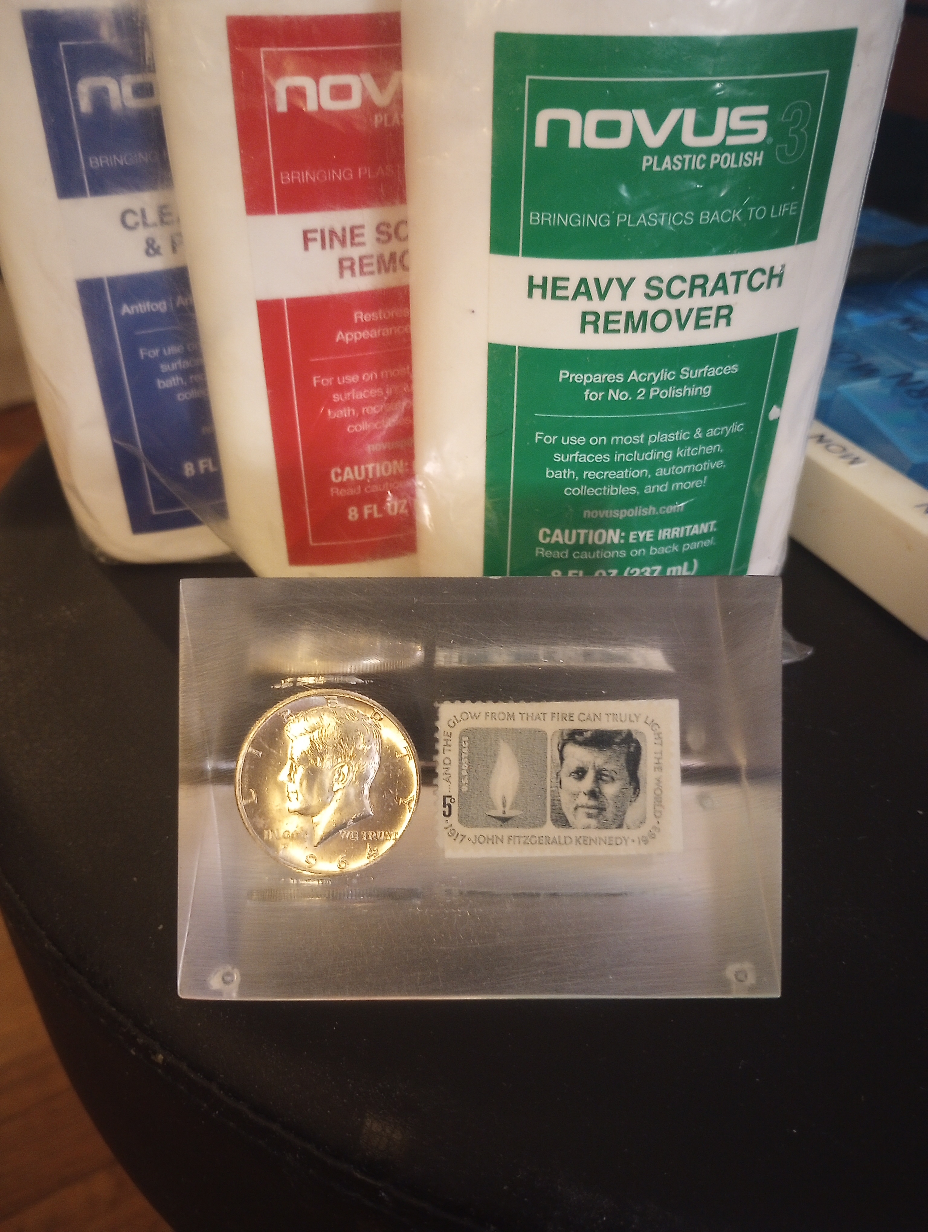 I started with some 80 grit then 150 grit which took about an hour then I used these Novus products. (No affiliation)