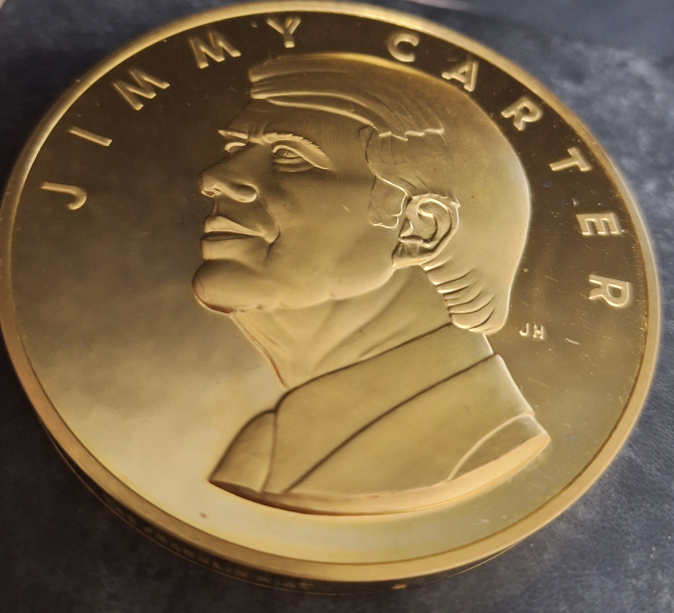Well, interesting from the standpoint of size - comes in at 70 mm diameter and weighs 466 grams. Edge mark reads "24kt" but XRF analysis is closer to 23kt. Would still put it over 14 troy ounces of actual gold. Four were minted in this size: serial #2 for Vice President Walter Mondale; serial #s 3 and 4 for Inaugural Committee Co-Chairs Vicki Rogers and Bardyl R. Tirana; and this one, serial #1, presented to President Carter by the Inaugural Committee