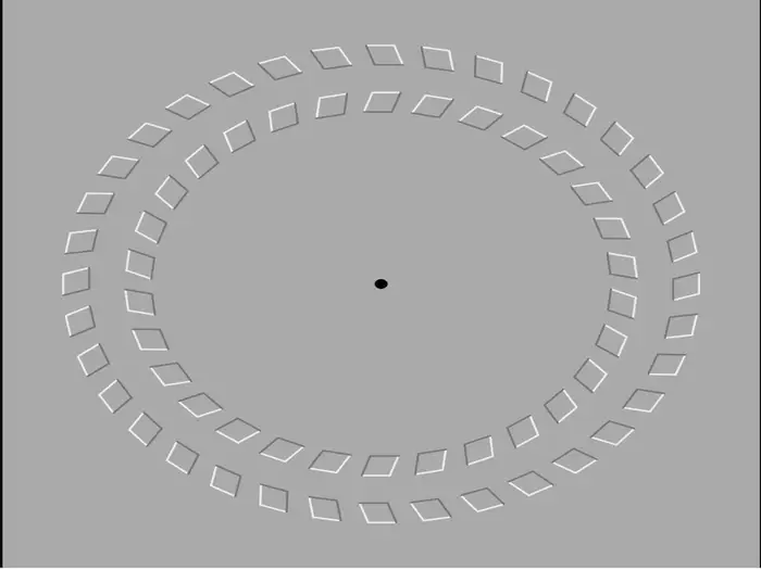 If you focus on the dot in the middle and move your head forward, the outer circle appears to rotate clockwise — move your head back and the motion changes.