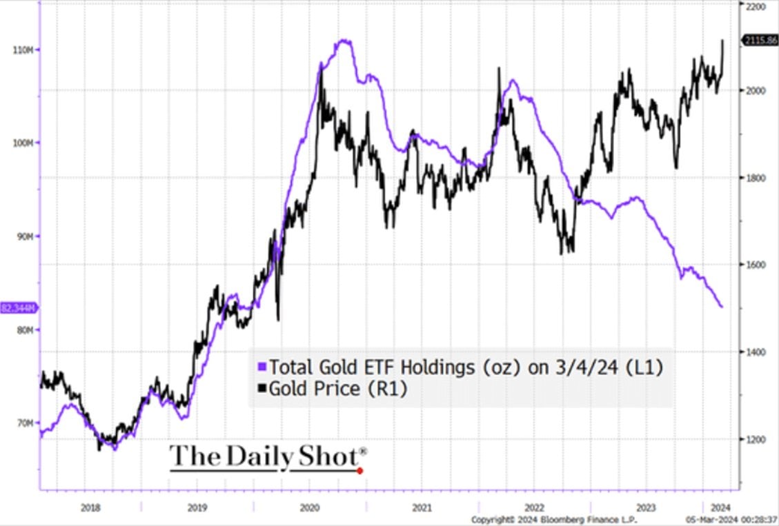 In recent years, gold price has diverged from ETF holdings. They used to correlate pretty highly, but not since 2022. I'll see if I can find a more up-to-date chart.