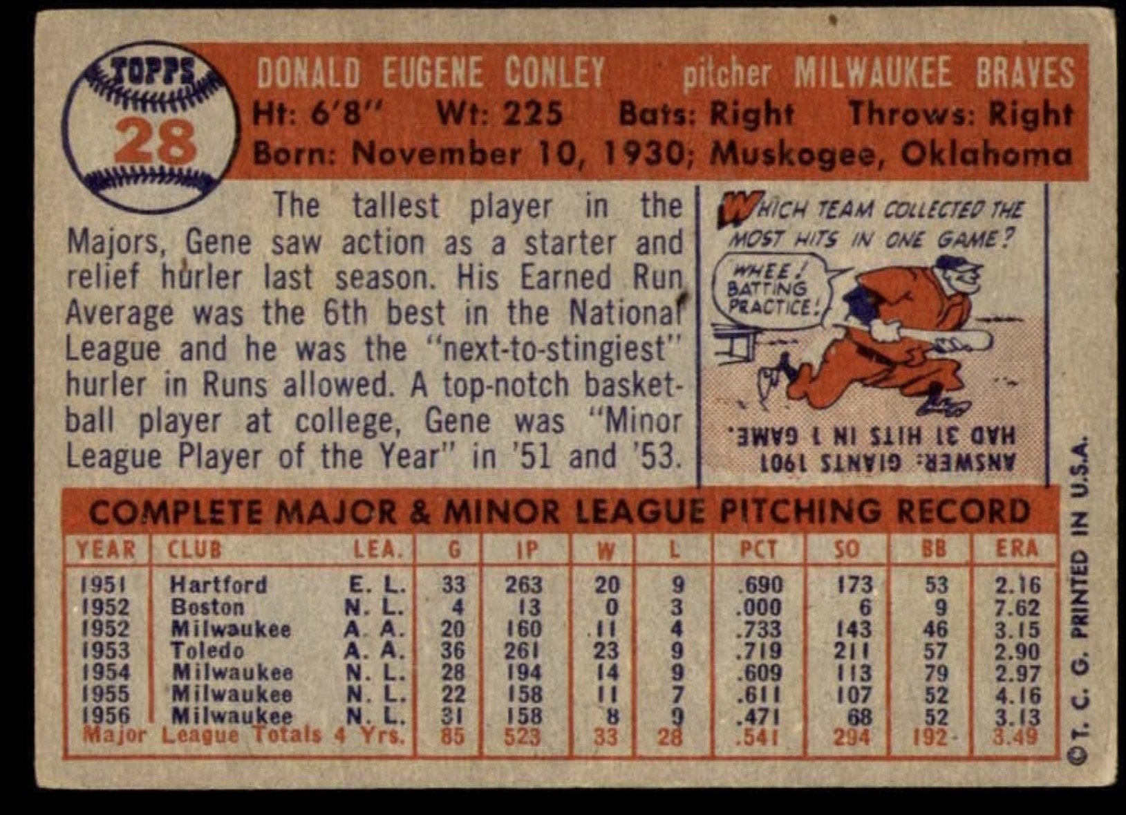 Conley gave up a 2 run HR to Mantle in the 57 series. The year Aaron was MVP and Spahn won Cy. Burdette dominated the Yanks in 3 games closing the series in NY. The 57 Braves were the first team in almost a decade to win the WS that wasn’t from NY.