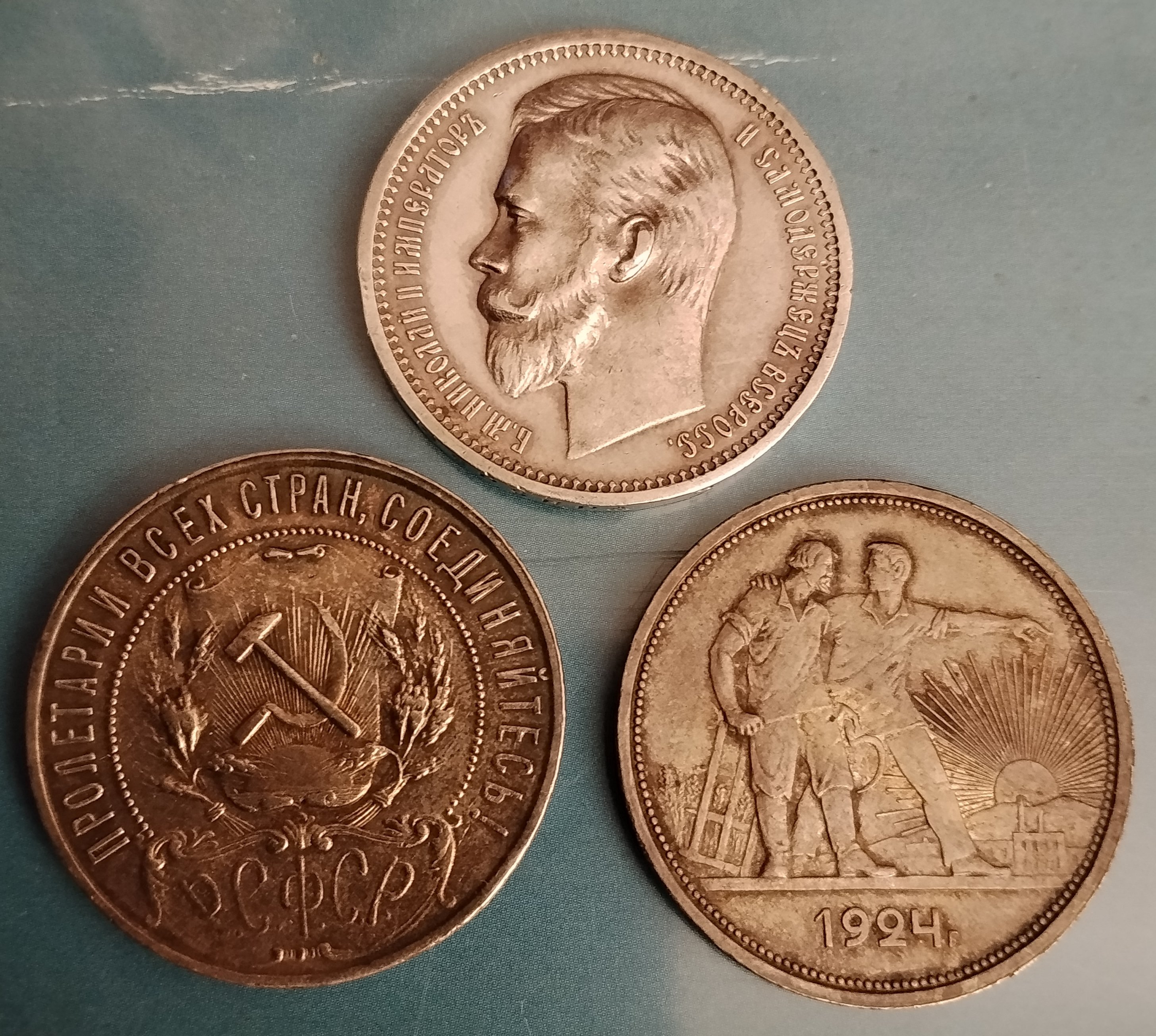 Roubles: 1912, 21, 24. Nikolai 2 was executed in 1918 (or just killed), time of the Civil War and by 1924 the communists had won the War (not my heroes but it's history). These coins have the same size, weight, purity of silver.