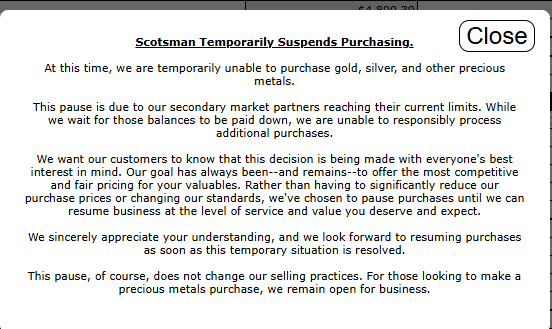 Hit a new shop in West Virgina earlier today. Sold off the rest of my Platinum at spot $2420. Was offered spot -$2 for ASEs, fresh BU rolls from a sealed box. Dealer wouldn't even give me a just give me your absolutely lowest I have to buy it from you price on 90%. Said it's taking weeks and sometimes months to get paid out because refiners are just not accepting it.
