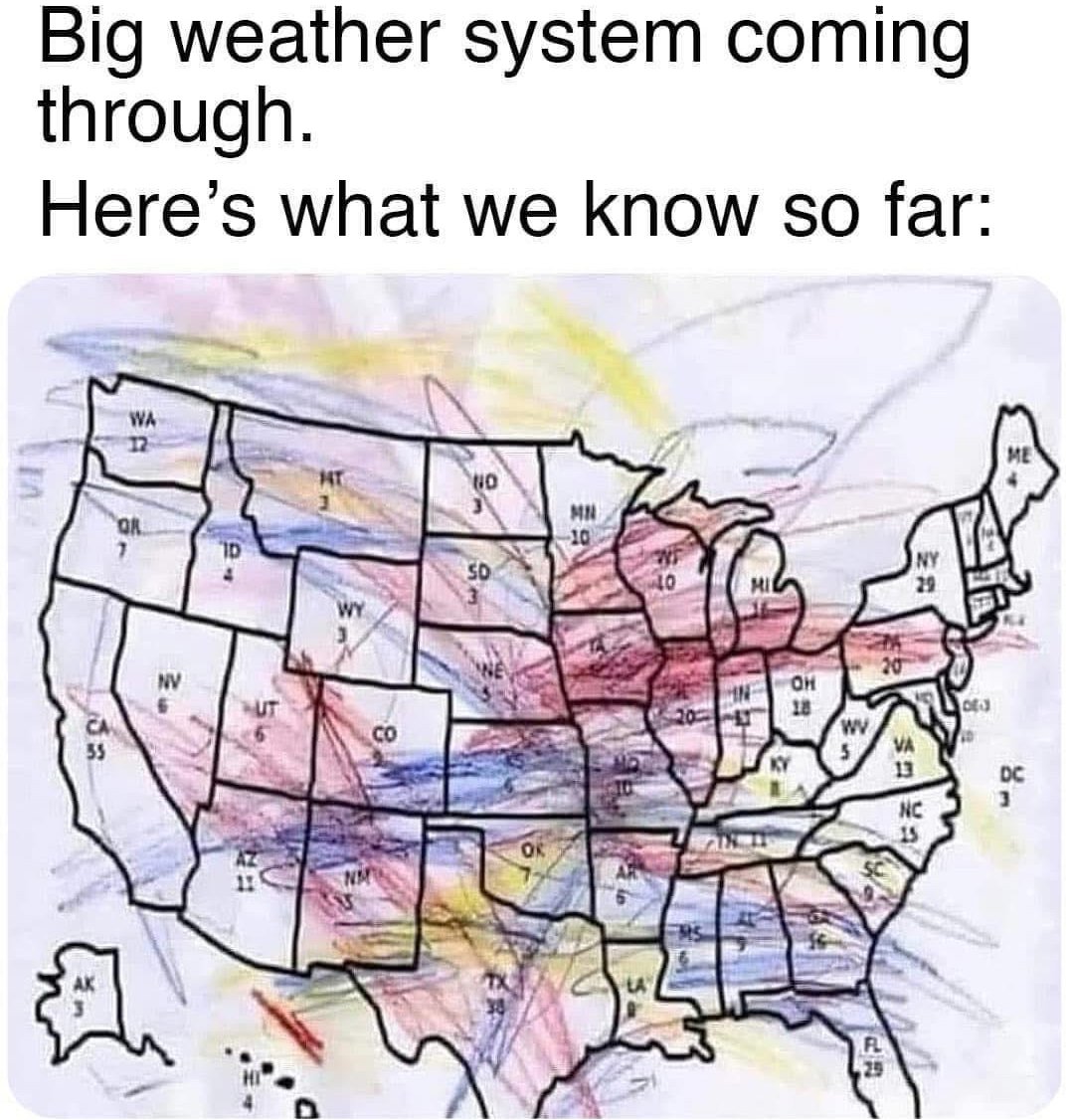 Brougt to you by the local pre-school weather predictor. I kinda like the colors on the map