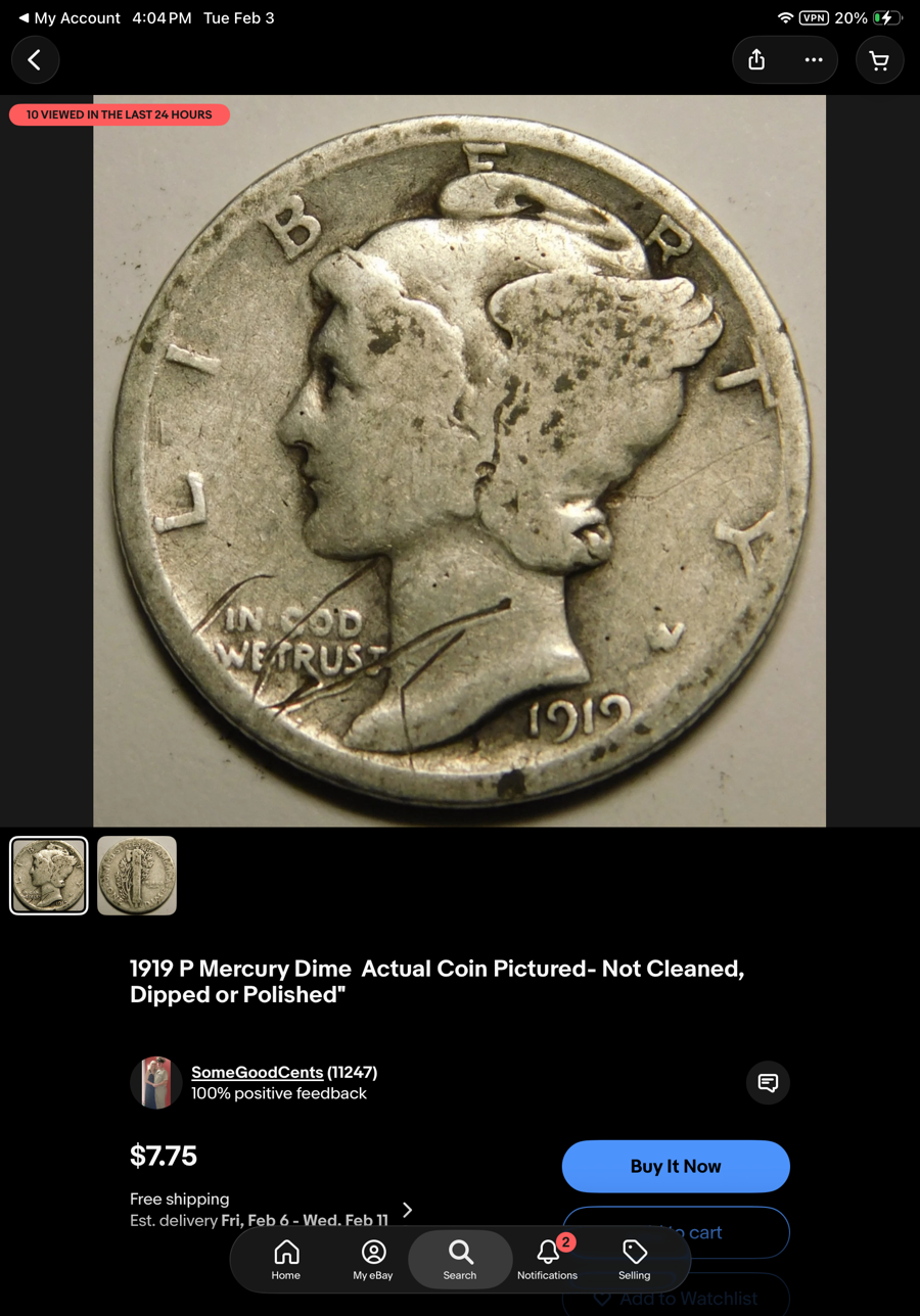 https://www.ebay.com/itm/117016829788?_skw=1919+mercury+dime&itmmeta=01KGJKSVZAZJ4DFYNWSXNNVZ7T&hash=item1b3ebf1f5c:g:HAYAAeSwsVVpge49&itmprp=enc:AQALAAAA8O7PUuNWmJ++UShgI9tQz/pCRnEjo+oFjCnEnmP09YQ01k/FO96pEgEKyk9zZrHNMnuohY+RbfW1jS1YjPxucNJ2QmTmWYyvMWRJrNW19mtKvGiqmcWLO6xrxYdfY9b65575cSSXnxDA+iYsaIgsM42FBEjNH3ictfLByzA1cf08zamsFTQajrh39PgakoA1T2slQrRDlPt42cpueaCGM5mWBaq8ktsQqIeGifxEBRzwtl3piegAFJVpD2L7p/HyP175drUK3nFJdfbOdpFBbMUTUcoDnzVuzcjorePulpuBBVEhUaPKBMm5ZaHlWSYzKw==|tkp:Bk9SR-S_59OEZw