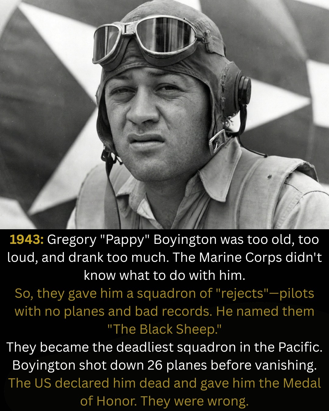 In January 1944, Boyington, outnumbered by Japanese "Zero" planes, was shot down into the Pacific Ocean after downing one of the enemy planes. He was captured by a Japanese submarine crew and was held as a prisoner of war for more than a year and a half. He was released shortly after the surrender of Japan.