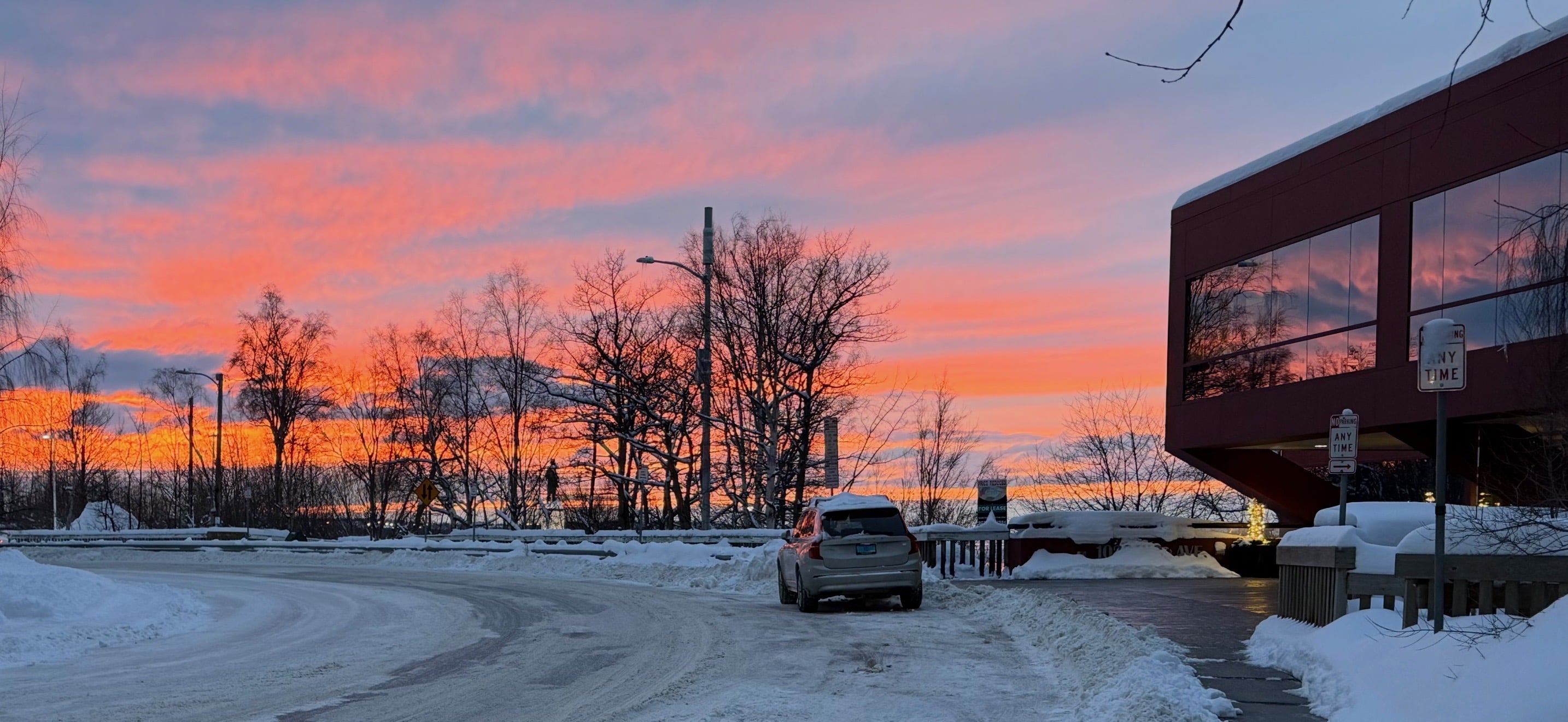 FIRST a view that includes the sunset's reflection off of my office building as my vehicle is parked in front of it. In the photo both the distant silhouette of Captain Cook and the Fire Red Sunset are visible: