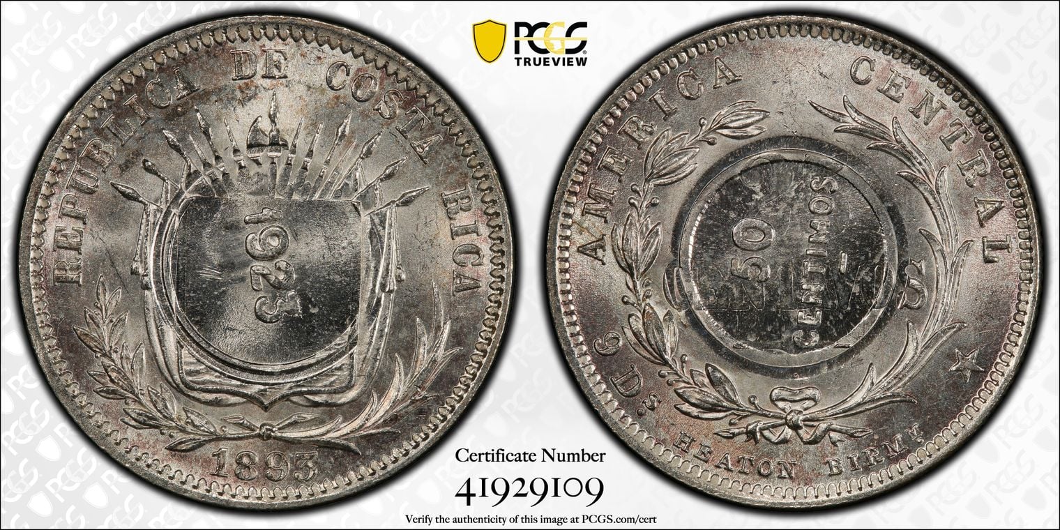 1923 Costa Rica 50 Centimos counterstamp on 1890 Costa Rica 25 Centavos