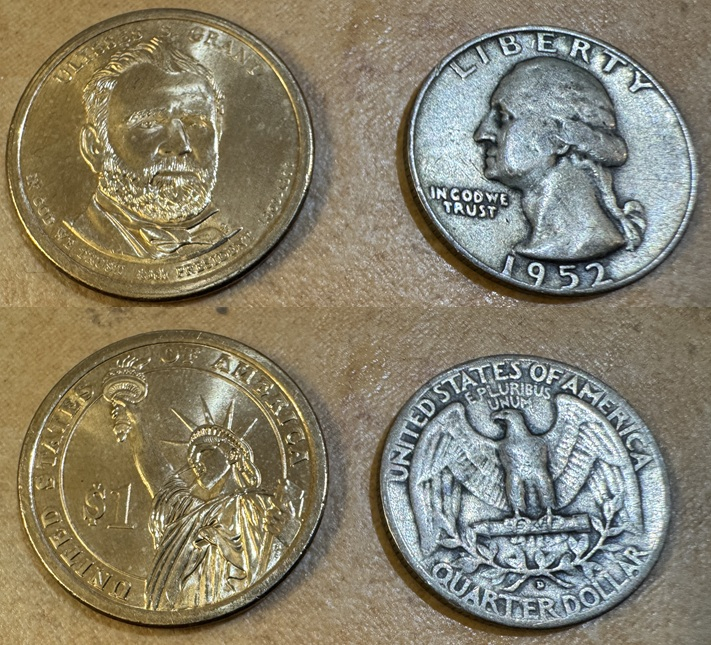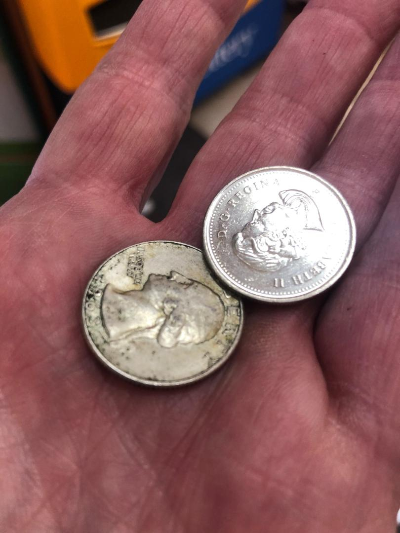 No gutter but got a Canadian Quarter, crusty old 1943 Steel Wheatie and $0.37 cents clad. RGDS!