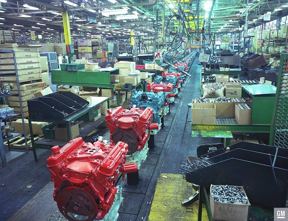 1966 Flint Michigan Buick assembly complex. Appears to be the transition from the nailhead engine in teal to the 400-430 engines in red.