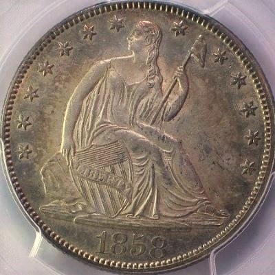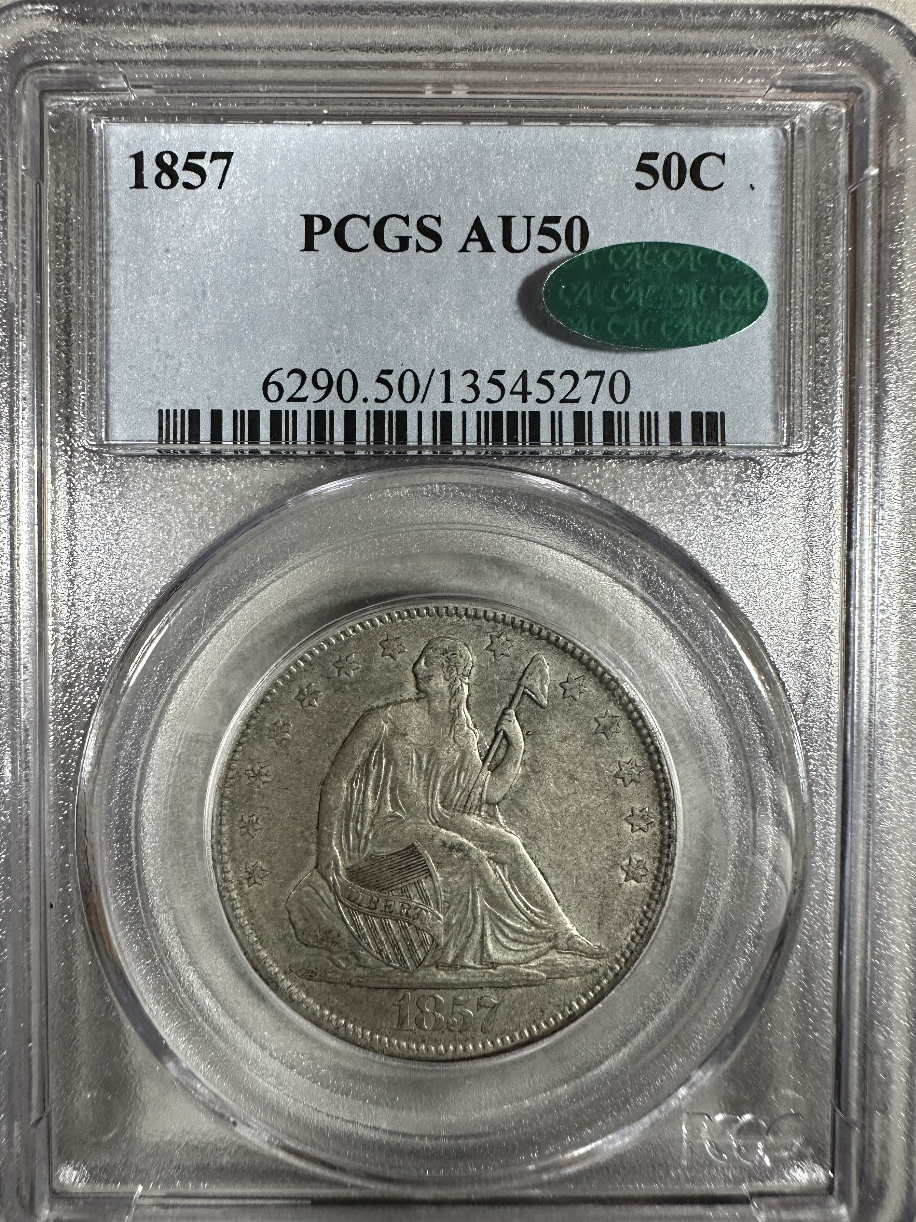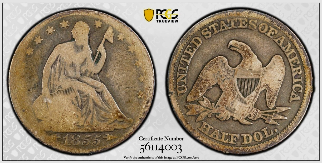 One of my favorite 1855/54 overdates, A WB-1 with the entire 1854 date visible underneath the 1855, just returned from PCGS. It just an AG3 but I love the deep, crusty original toning and excellent overdate on this coin. The Trueview was overexposed again (it looked like a dead fish with faded color), so the brightness was reduced to better approximate the coin in-hand.