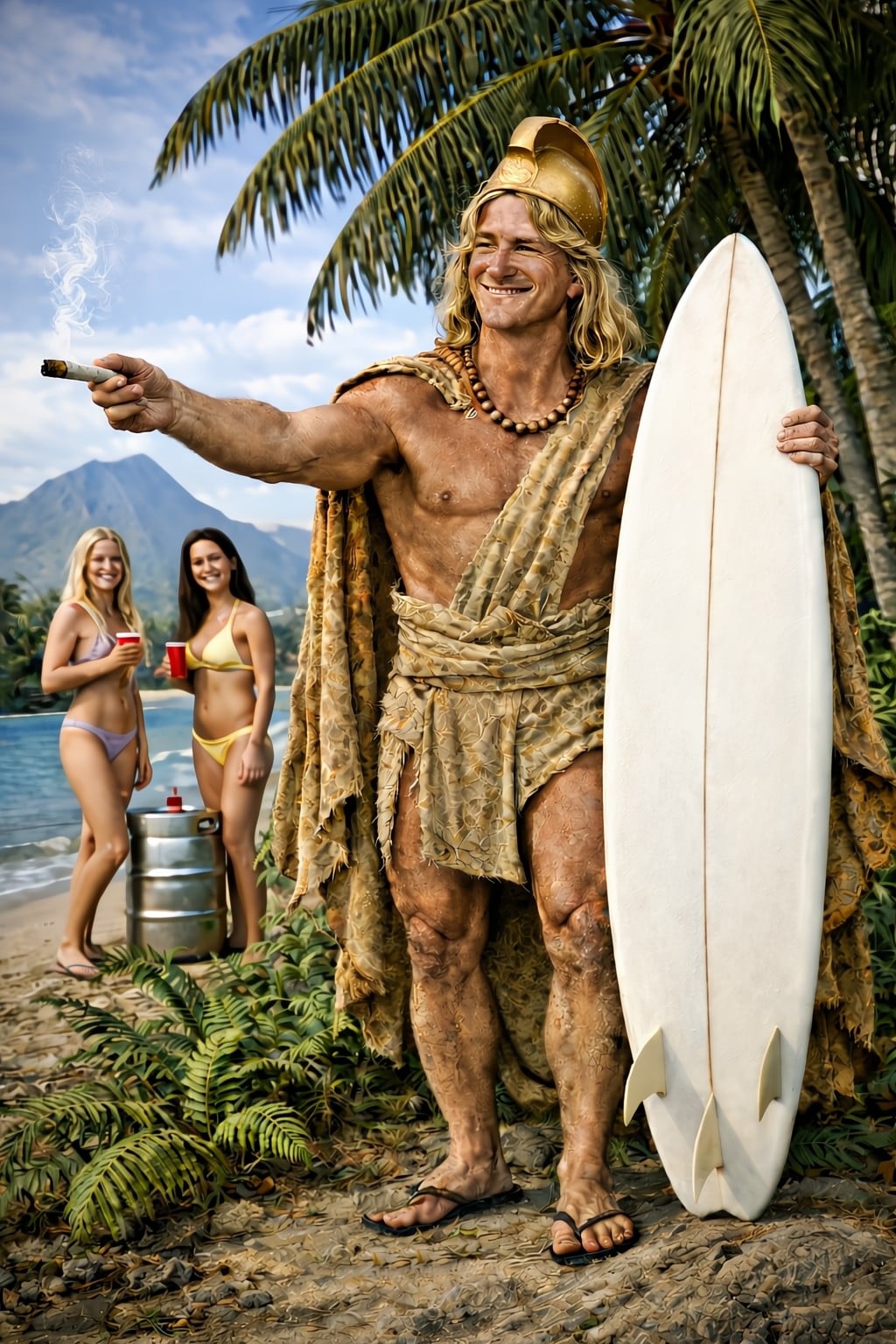 the hawaiian needs to look like spicoli with a surfboard but with the traditional garb shown
