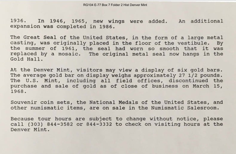 I went on a school field trip to the Denver Mint in the spring of 1965 when I was in third grade. I remember seeing the display of gold bars displayed in an open safe behind plexiglass.