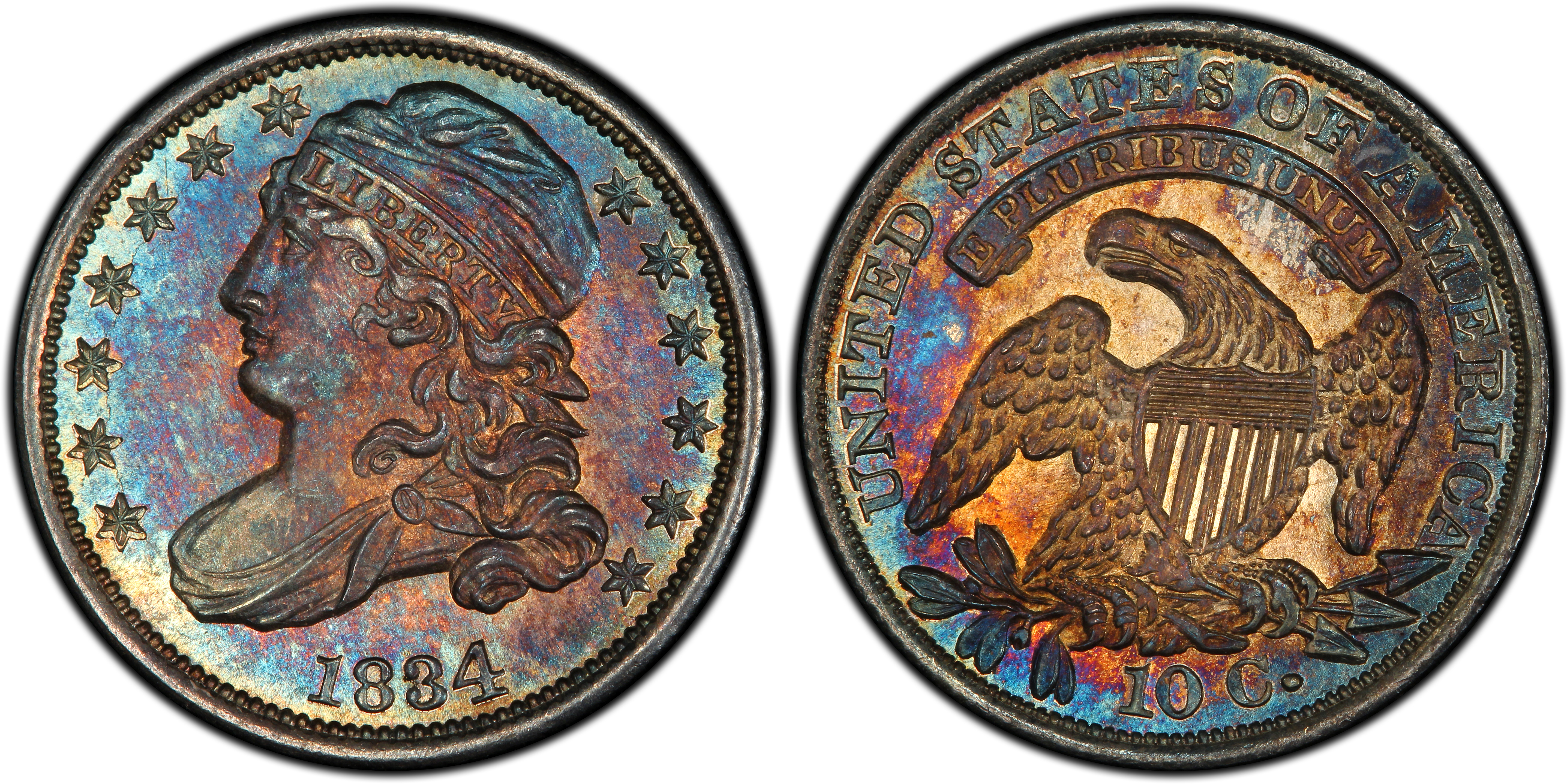 Here is a 1834 Capped bust dime. It has great prooflike surfaces and toning. (FYI- It was once in an old NGC holder graded 68! Holly cow!.