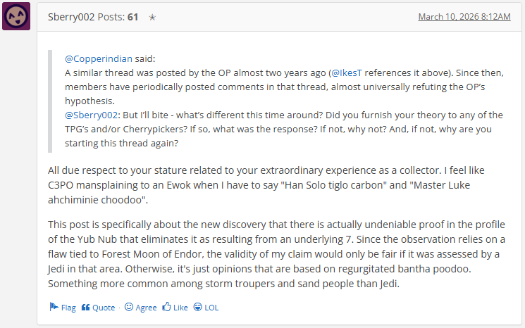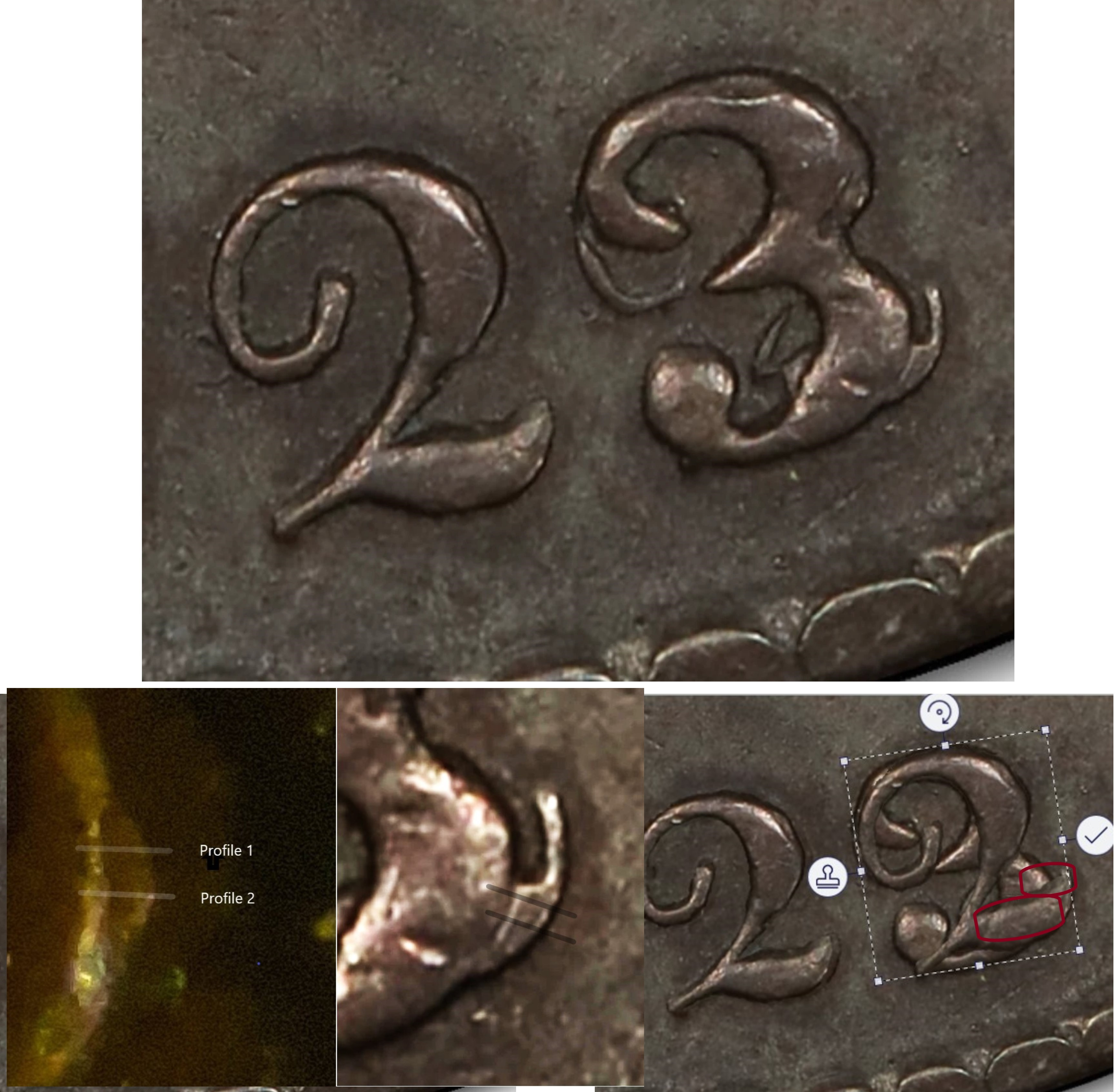 This post is specifically about the new discovery that there is actually undeniable proof in the profile of the nub that eliminates it as resulting from an underlying 7. Since the observation relies on a flaw tied to material flow, the validity of my claim would only be fair if it was assessed by an expert in that area. Otherwise, it's just opinions that are based on regurgitated wife's tales. Something more common among author's and coin dealers than engineers.