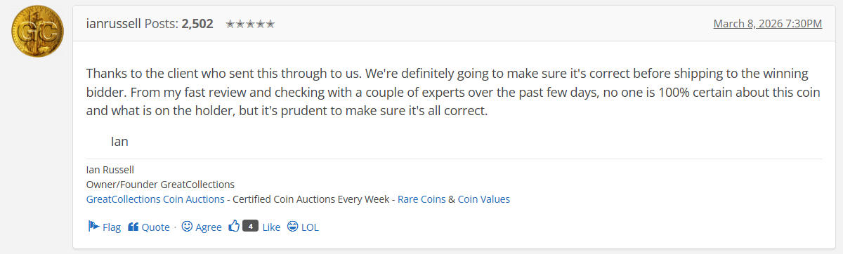 I don't think that what I've asked is groundbreaking, while I do not have an example right off hand, in the past auction houses have pulled lots prior to the sale if there are serious concerns, even ebay. I think there are legitimate concerns over what this is vs what PCGS has determined, as such it seems prudent to fully verify what testing was (and was not) done before auctioning off this item. Apparently it has been reported in the 2017 cent thread that the cert for that coin is now inactive. That may only mean that a new cert was issued without any change to the status of the coin, or it could be that the status was changed as a result of further testing. Hopefully @ianrussell will be able to provide an update on what happened.