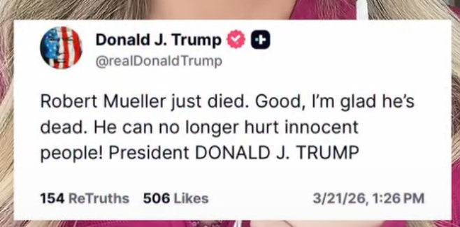 And when he dies (hopefully of natural causes), I’ll post the same thing about him that he posted about Mueller. What goes around comes around