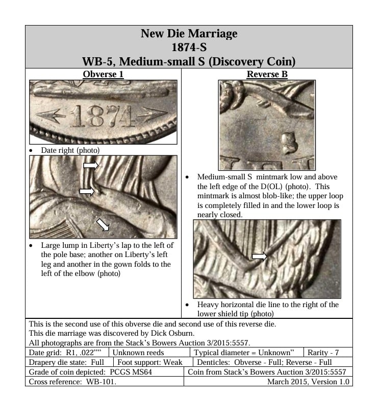 The 1874-S WB-5 is a combination where both dies were previously described and labeled as "Obverse1" and "Reverse B." There is absolutely no question regarding its legitimacy. And you do NOT get to be creative and call it something other than "WB-5."