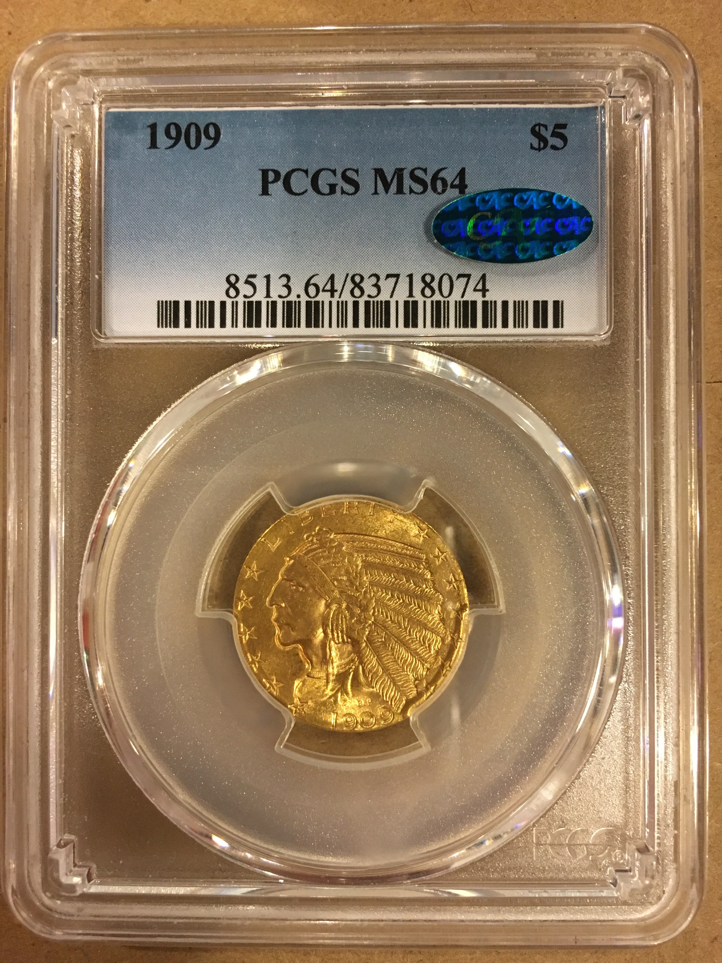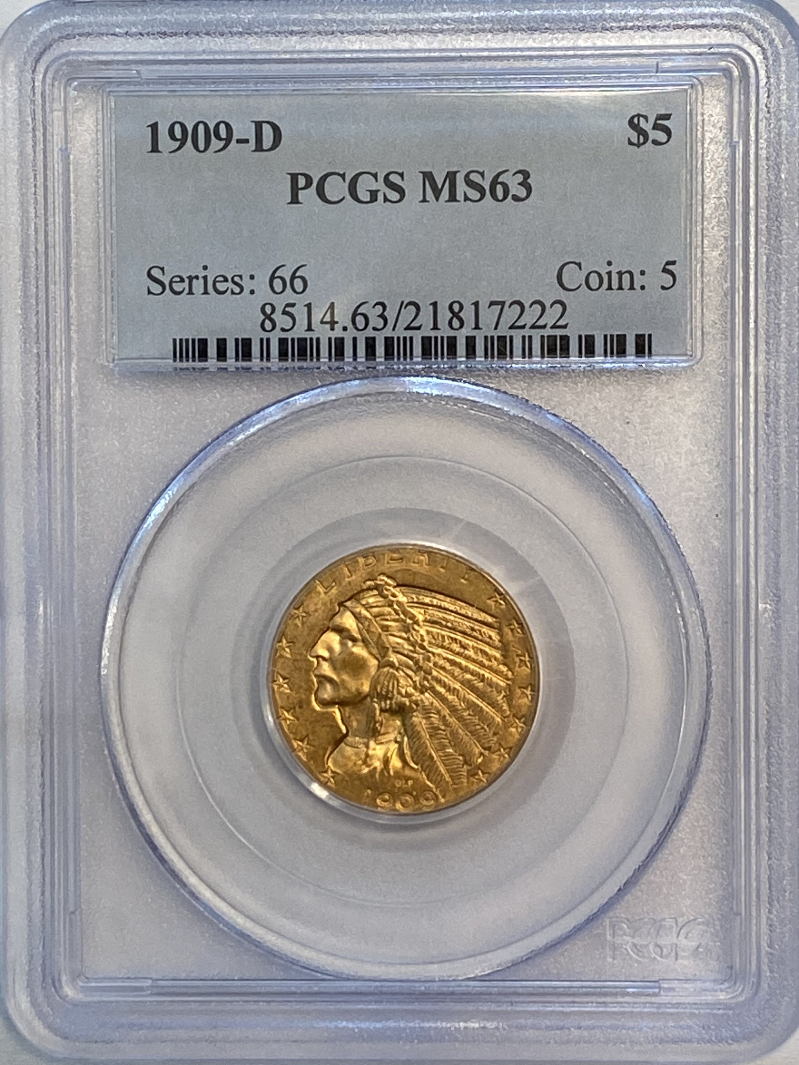 The PCGS cert number is 82990824. A 1909 $5 PCGS 66+ cac.