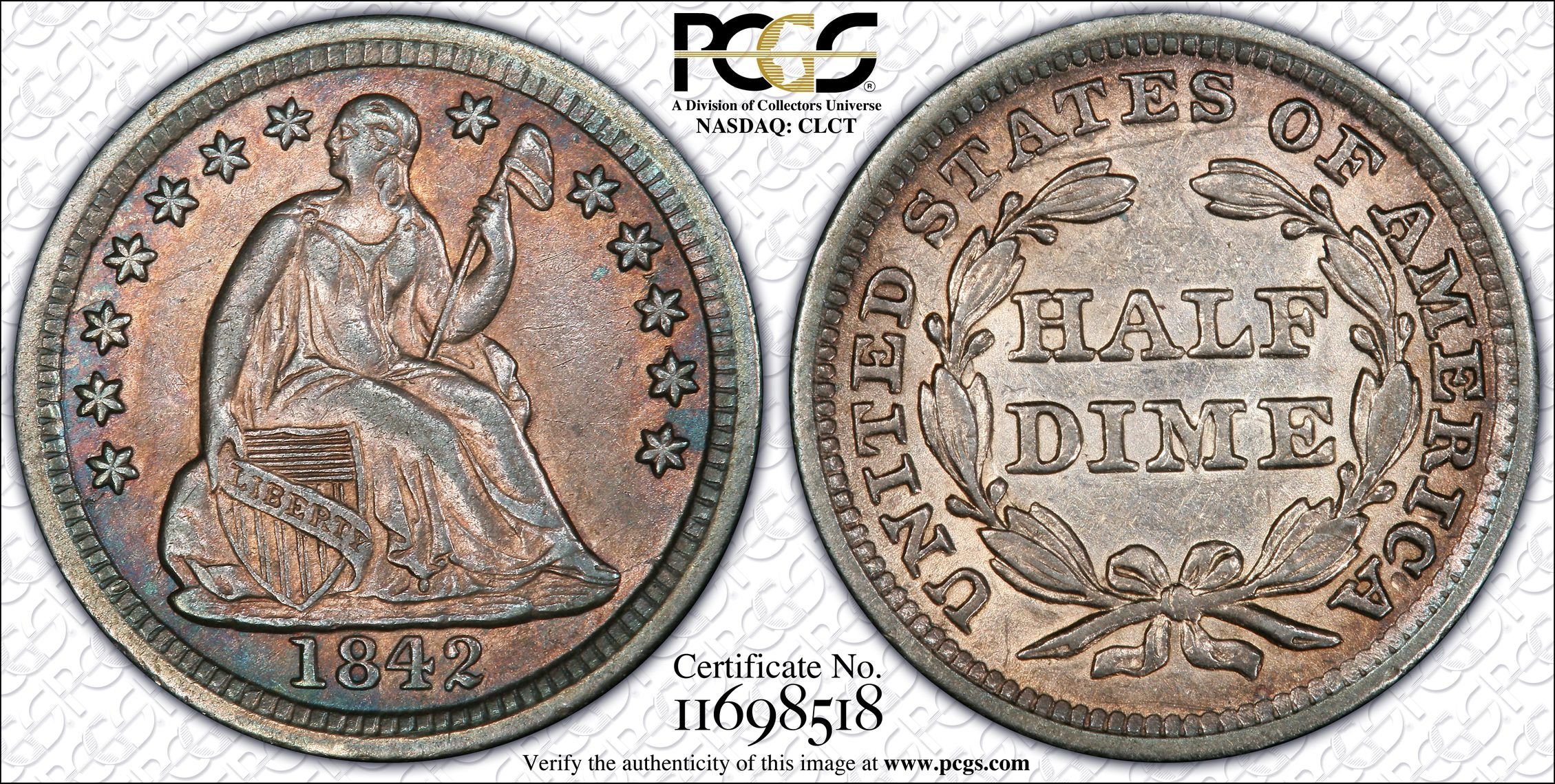Here, I'll start, with an 1842 Seated Liberty half dime.